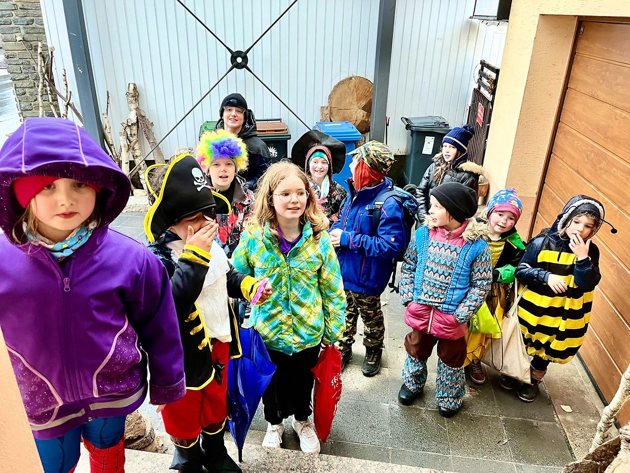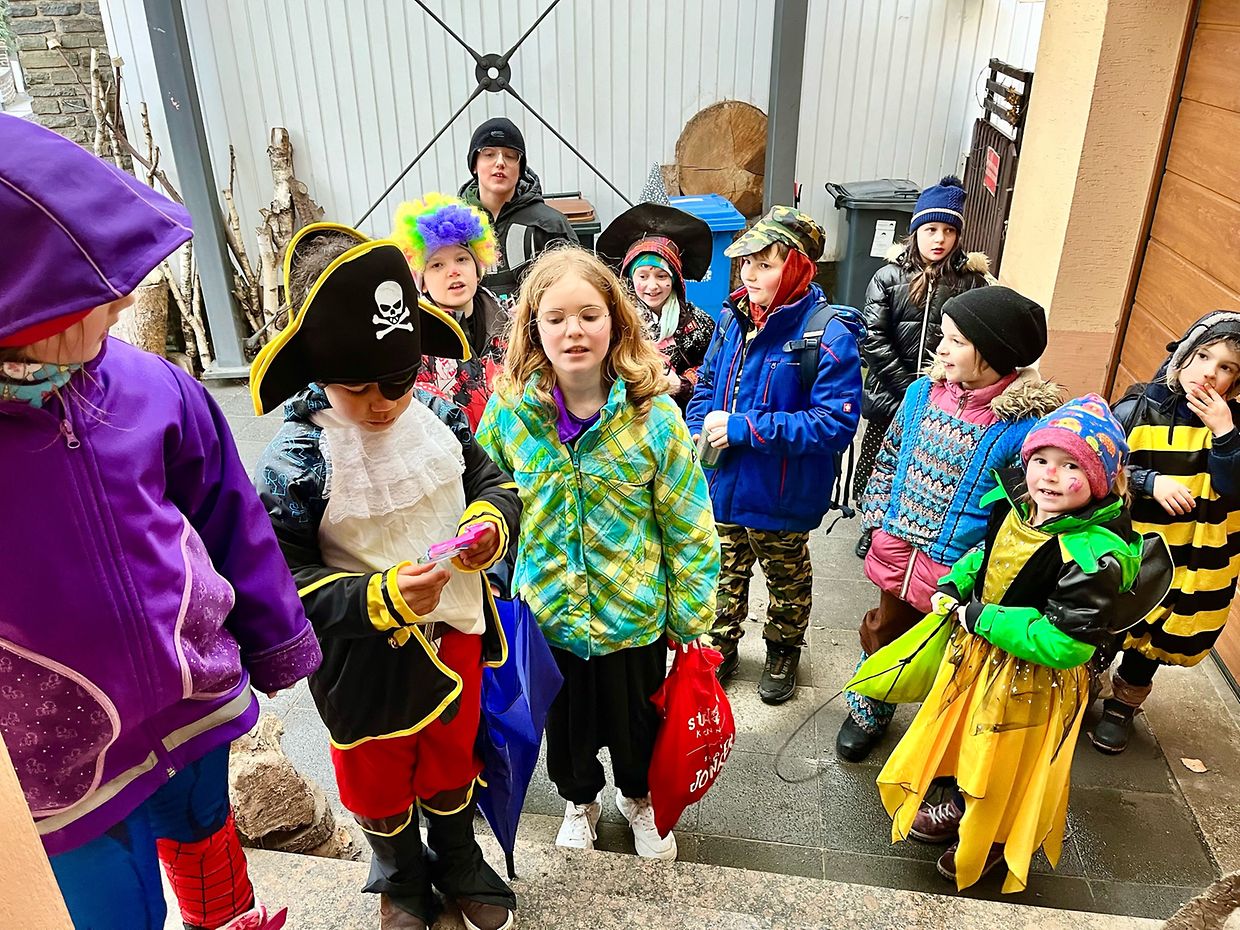 Fettendonneschdeg (an Däitschland Aalweiber) gin Kanner verkleed durch Doorf.