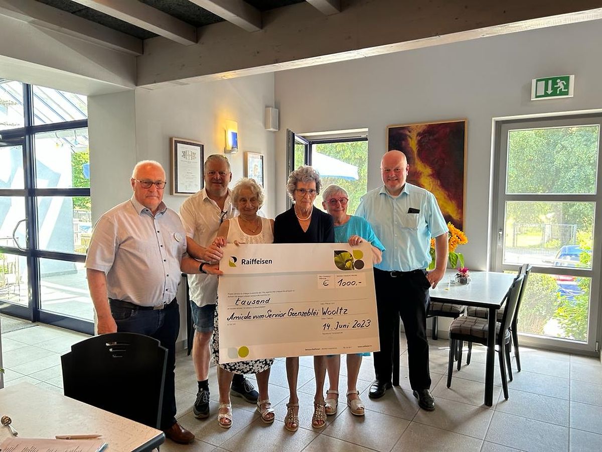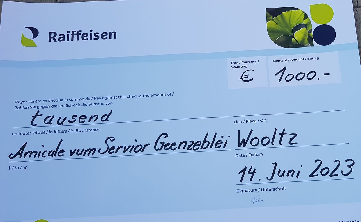 Harel: Presidentin Madame Henriette Michels vun den Altersfrënn vum Stauséi hat op Generalversammlung den President Huet Jing mat enger Delegatioun vun der Amicale aus der Geenzbléi Woltz invitéiert an hinnen een Don vun 1000 € iwwerreecht. De President vun der Amicale war frou iwwert deen generéisen Don an hott dem Comité matt sengen Memberen vun den Altersfrënn een grousse Merci gesoot an hinnen erkärt wat si alles ënnerhuelen mat hiren Suen fir Bewunner aus der Geenzebléi. Bei senger Reed hott heen ewer och betount datt dat engem richtig gutt giff dunn, wann anner Veräiner aus der Regioun giffen gesinn, datt an der Amicale Geenzebléi zu Woltz am Altersheim eng gutt an wichtig Aarbicht giff geleescht ginn, an als Belounung d’Amicale dofir ënnerstëtzen.