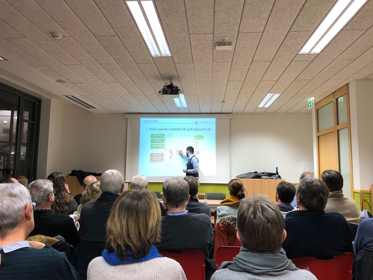 Im ersten Teil des Vortrags unterzog Christian Tock die lineare Wirtschaft einer kritischen Analyse. Er zeigte vor allem die ökologischen Grenzen dieser traditionellen Wirtschaftsform auf und betonte die Energieabhängigkeit von den Ländern, welche im Besitz der natürlichen Ressourcen sind. Der etwas provokante Titel der Konferenz bezieht sich auf die Grenzen des Recyclierens, welches zwar auf dem Vormarsch, jedoch weit davon entfernt sei, ein Wundermittel für wirksamen Umweltschutz zu sein. In diesem Zusammenhang hat der Redner daraufhin das Modell der Kreislaufwirtschaft als Modell der Zukunft vorgestellt, welches einen effektiveren Umgang mit den natürlichen Ressourcen befürwortet und somit die negativen Folgen für die Umwelt verringert.