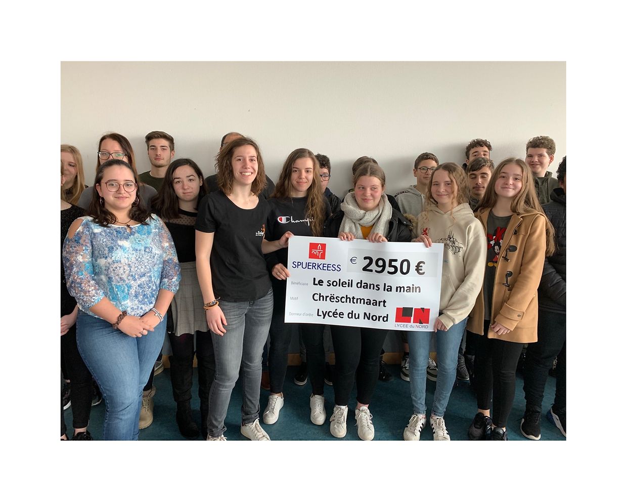 Zu dieser Schecküberreichung, die im Coffee House des Lycée du Nord stattfand, waren die Klassen ACCU1 und 6P4 eingeladen, die zusammen mit ihren Lehrern Ursula Herbrand, Dominique Berton und Aloyse Schommers einen Großteil der Vorbereitungen für den Markt übernommen hatten, sowie Vertreter der übrigen Klassen und des Schülerkomitees, die sich ebenfalls am „Krëschmaart“ beteiligt hatten.