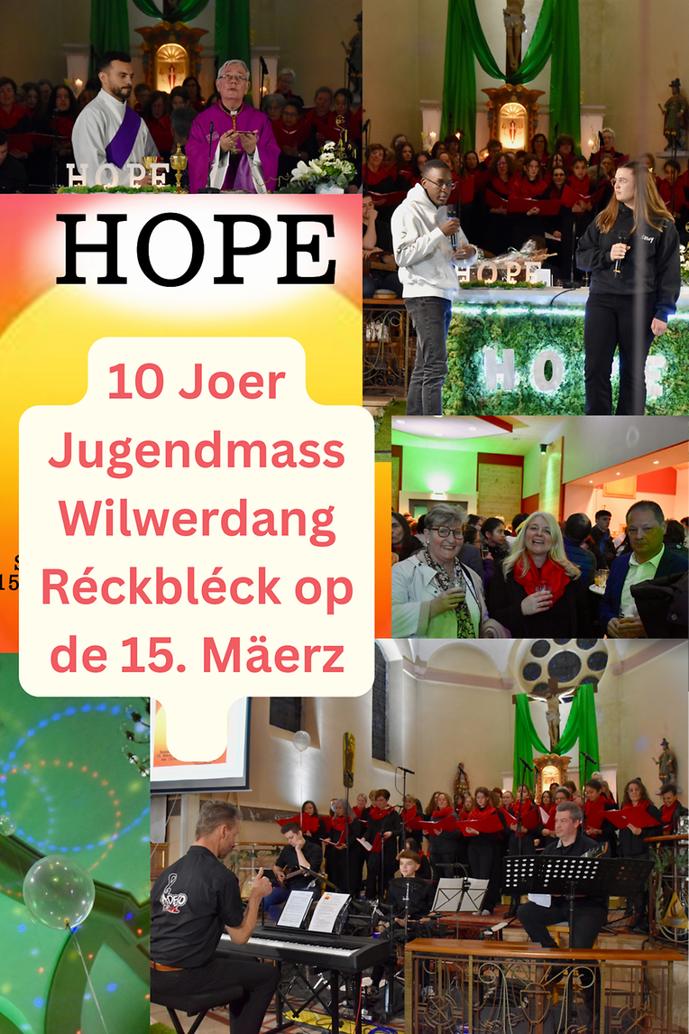 Samedi le 14 mars à 18h30 aura lieu la messe des Jeunes à Wilwerdange avec le Cardinal Jean-Cluade Hollerich. Le groupe des jeunes de la paroisse Troisvierges-Weiswampach et la chorale des jeunes Adesso Special vous invitent cordialement à ce moment fort pour les jeunes et aussi pour les moins jeunes.
