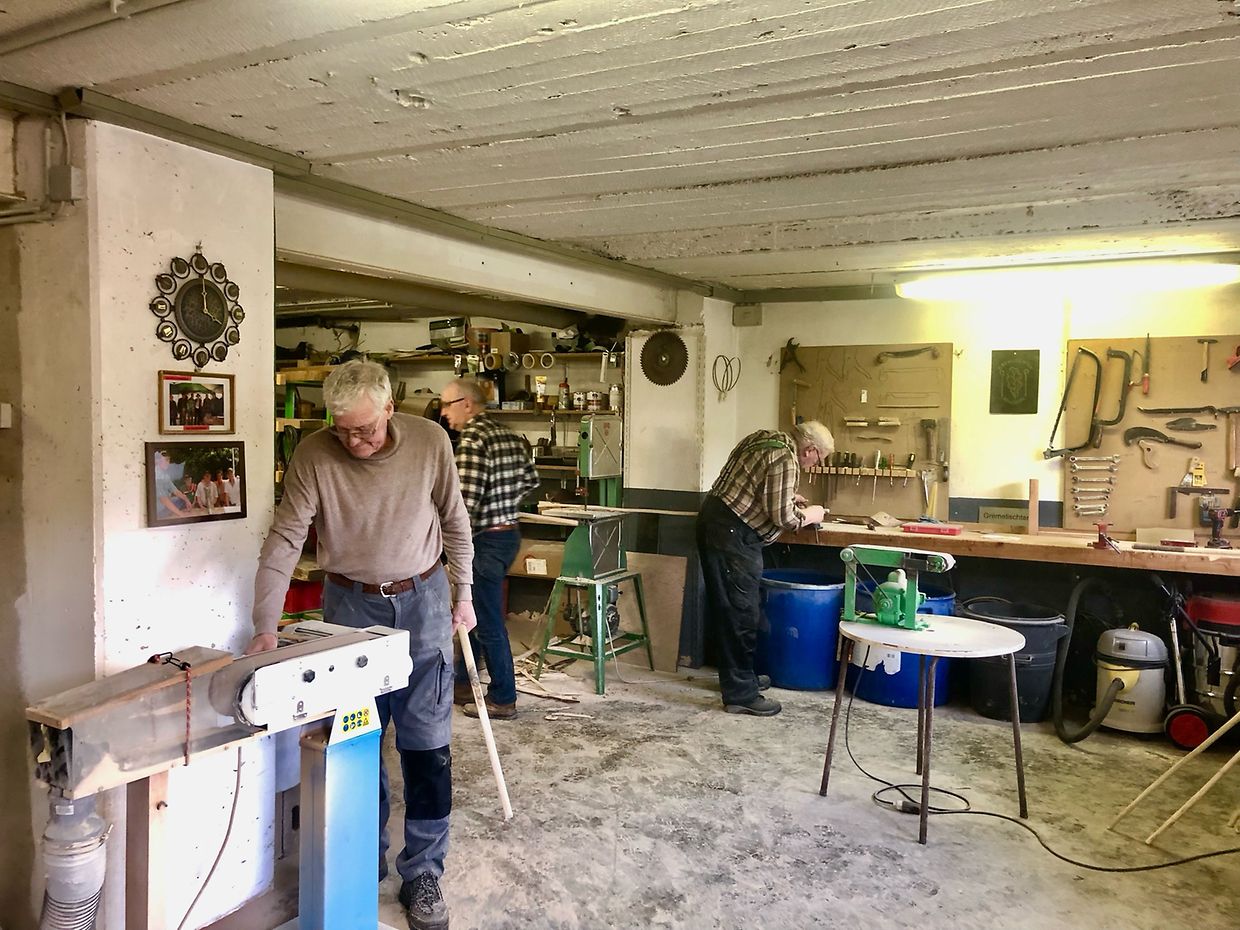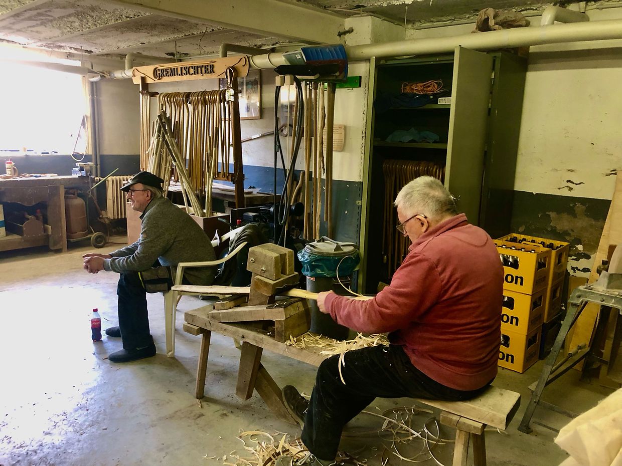 Die Grëmmellëschter, die stärksten Wander- und Spazierstöcke, die es gibt, sind im ganzen Land berühmt, sie wurden sogar dort hergestellt. Die Idee zu diesen Stäbchen stammt aus der Wallonie und wurde von einem Hirten namens Joseph Mellang aus Knaphoscheid aufgegriffen, der in Diensten eines Grümelscheider Bauern namens Weyrisch stand. In der Wallonie wurden Stöcke aus Birkenholz hergestellt. Mellang versucht dafür Eiche zu verwenden, verwendet gerade Stämme ohne Knoten, die er trocknet und in vier Teile schneidet, nachdem er die Rinde und das Kernholz entfernt hat. Dann schneidet er sie auf ihre endgültige Größe und rundet sie grob mit einem Messer ab. Der als Griff zu verwendende Teil des Stammes wird mit Rübenblättern gebacken, bis das Gerbstoff entfernt ist und der Stock weich ist und sich über das 8 cm dicke und 50 cm breite Spannbrett spannen lässt.lang um einen Block 12 cm hoch und von gleicher Dicke mit Löchern im Abstand von 3 cm, in die Stollen gesteckt wurden, wohl wissend, dass diese Stollen dazu dienten, den Stock zu halten. Auf diesem Brett verbleibt der Stick dann etwa zwei Wochen und trocknet in der Nähe des Ofens. Einmal vom Brett gelöst, hat es die gewünschte Vorspannung, die sich bei verschiedenen Herstellern ändert. Anschließend wird der Stab geglättet und mit Schleifpapier behandelt, mit einer Schicht Leinöl überzogen und poliert. Schließlich wird eine Eisenhacke oder -ferse an seinem unteren Ende platziert. Stämme mit einem natürlichen Bogen werden auch verwendet, nachdem sie durch Regen oder Wasser aufgeweicht wurden.