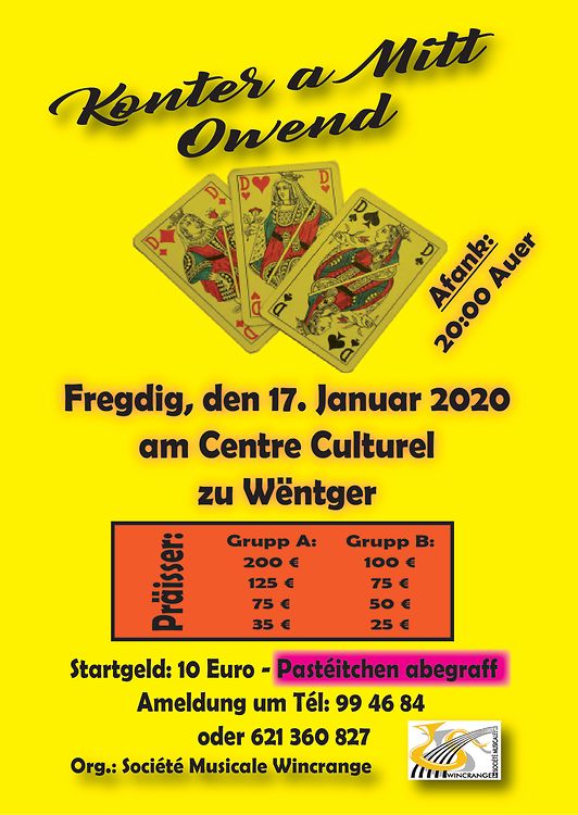 Een Fregdig den 17. Januar, Kaartenowend zu Wëntger am Centre Culturel. Start ëm 20:00 Auer, d'Kees ass op vun 19:30 Auer aan. Anmeldungen kann om 99 46 84 oder om 621 360 827 gemmat gien. D'Startgeld senn 10€, an deem Präis ass eng gudd Pastöitchen abegraff. Déi déi neck mat der Kaart spillen well kann gären eng Pastöitchen eessen kommen. Et ass oh eng Flott Tombola do. Also dann bis een Fregdig zu Wëntger