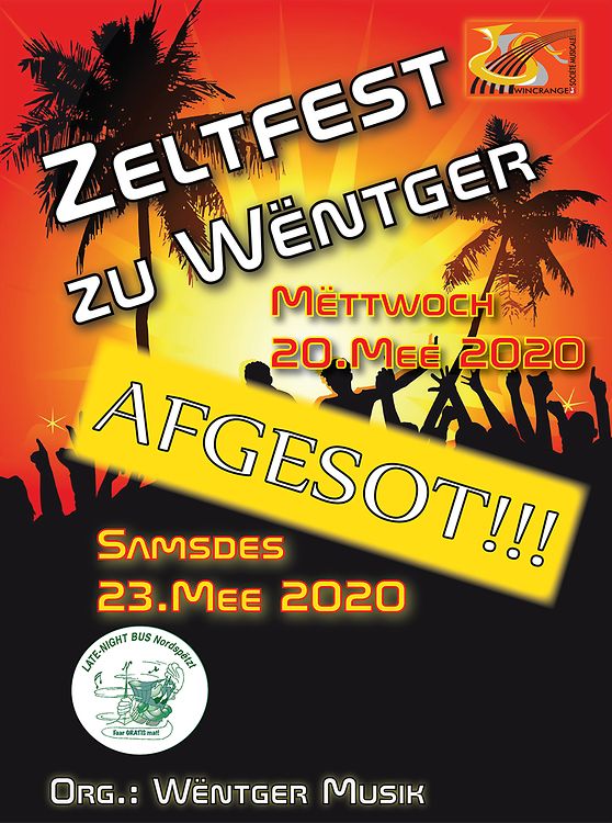 Eist Zeltfest am Mee soen mer wéinst dem Corona Virus af. Merci fir äert Verständnis. D' Wëntger Musik