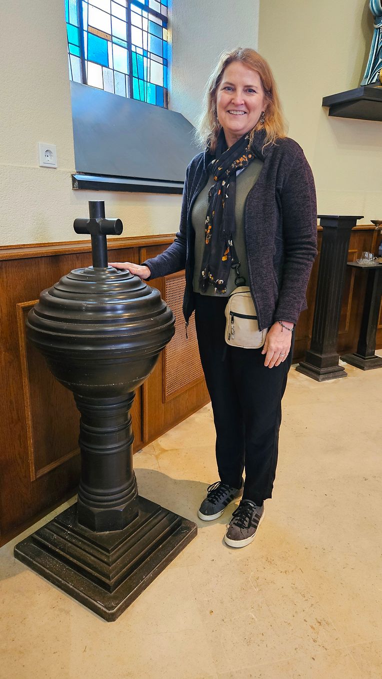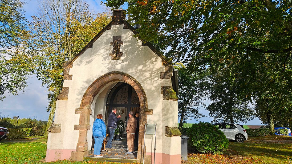 In the morning we first went to the “Klaus” in Wolwelange. A Klaus is an hermitage and according to an old legend a royal from the nearby Bigonville who had killed his stepbrother on that exact place later spent a repentant hermit existence in the 13th century on this place. The village church of Wolwelange was also on this spot. A small chapel remembers the old days. It is dedicated to the Painful Mother Maria and the 14 Holy Helpers. The original statues of the Holy Helpers are now in another church, at the chapel they are now represented by figurines made of porcelain. Wolwelange is a very old village and existed already during roman times. The old village was decimated by the soldiers during the war of 30 years and by the plaque and abandoned around the year 1637. Polish and creation soldiers killed the people and burned down all the houses. Later a new village and a new church, dedicated to St. Peter and Paul , were build a mile further to the west and is still existing today. Our fantastic guide here, was my friend Frank Dimmer who made an amazing presentation about the history. Villmols Merci Frank. He gave some explanations about the hermitage and a very deep incursion into the history of the parish and the church. He showed has some gems inside and outside the church. One particularity of the church is for example that the altar, baptismal font and station of the cross are made of the local slate stone. During the visit Mia had the pleasure to touch the baptismal font where here ancestor have been baptized.