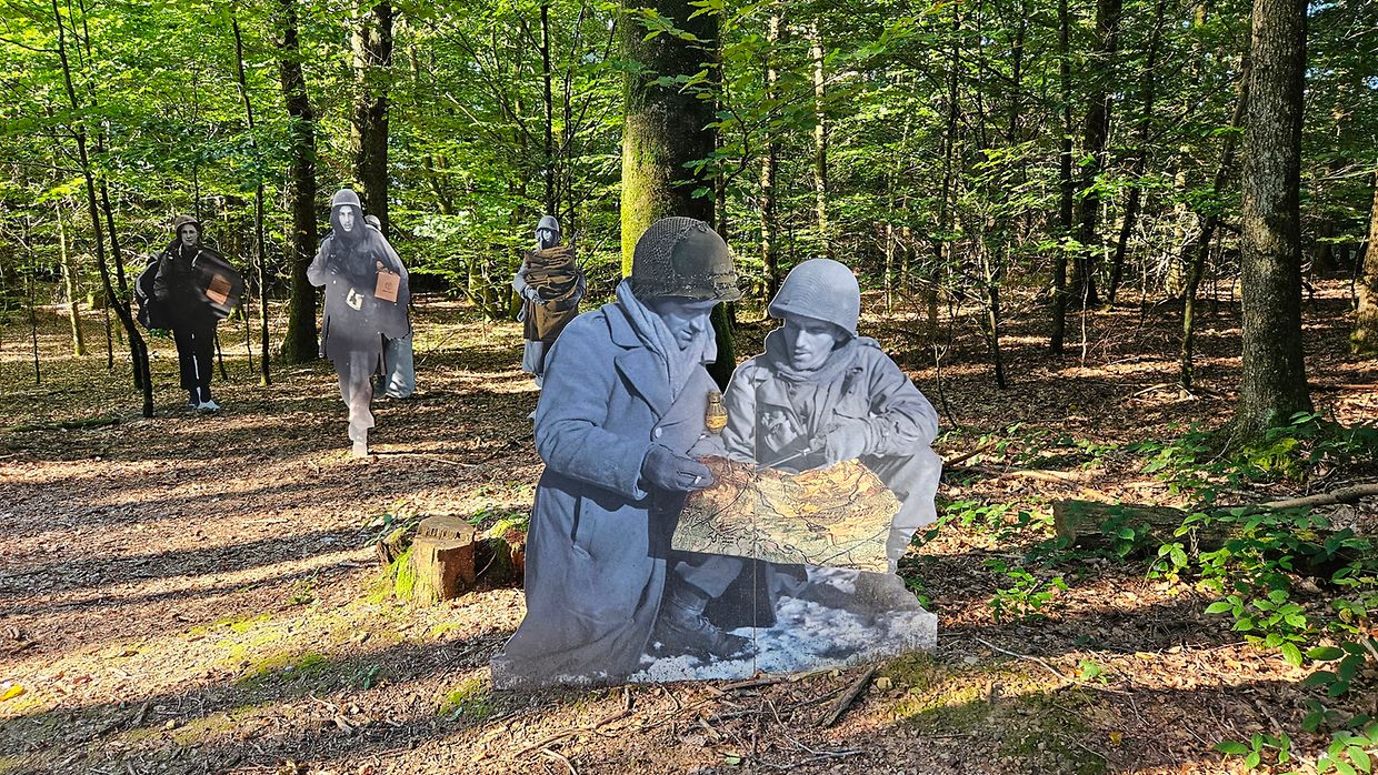 A short walk on the WWII Memorial trail at Schumanseck near Nothum concluded the day. The trail leads by the remains of the fights like foxholes and trenches and is enriched with human sized silhouettes taken from pictures dating from the time of the battle. Indeed this place is the site of one of the deadliest fighting during the Battle of the Bulge. Thousands of soldier have lost their lives here. Today it is a quiet and peaceful forest, 80 years ago IT WAS THE HELL. Finally we had dinner at the famous Restaurant Schuman which was completely destroyed during the fights.