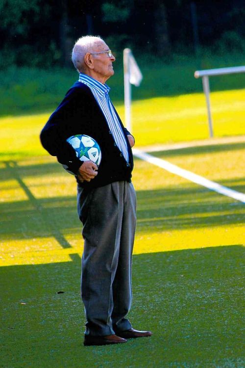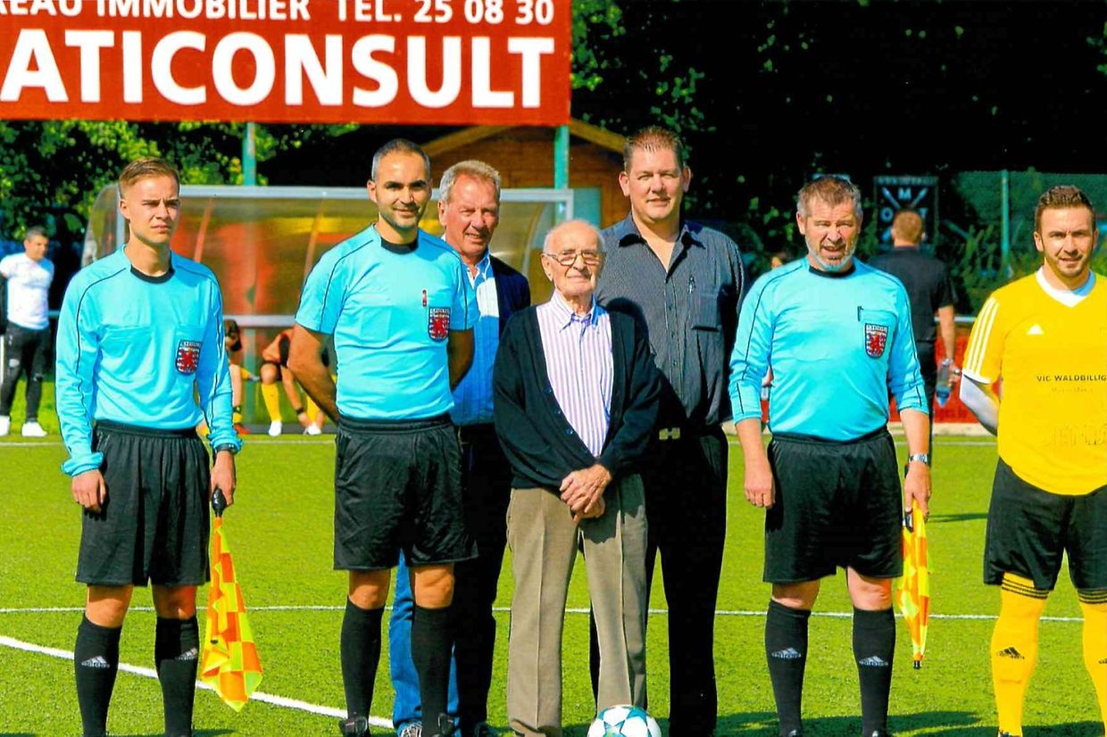 Ulässlech vum 1. Heemmatch geint Beggen vum Championnat 2017/18, huet den Léon Pundel (*1921) der 1. Equipe vum FC Koeppchen den Matchball offréiert.