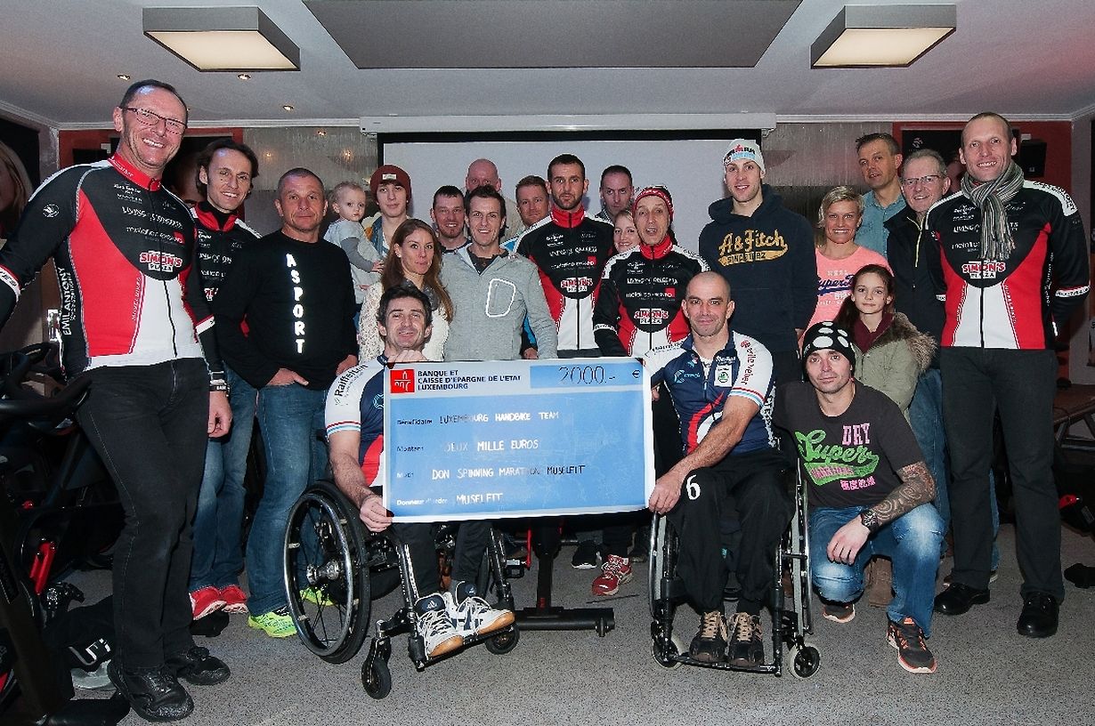Den Freiden Owend gouf vum Traiteur an Patissier Schumacher an dem Team vun MUSELFIT een Spinning Marathon organiséiert bei deem den LHT een Chèque vun 2000€ iwwerreecht krut. Am Numm vum LHT (Luxembourg Handbike Team) soen mir villmools MERCI un den Schumacher an un all Sportler deen fir eis dësen 5 Stonnen Spinning Marathon gefuer ass. Et war eng mega Ambiance an mir hunn och 85 km laang um Bock geschweesst! Luciano & Joël