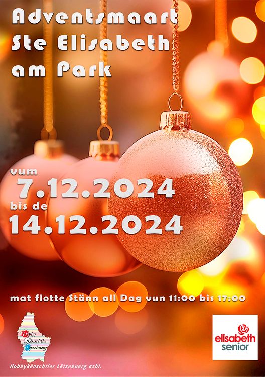 Luxemburg - Zentrum Adventsmaart am Ste Elisabeth am Park, Lëtzebuerg Hobbykënschtler Lëtzebuerg asbl Veröffentlicht am Donnerstag, 12. Dezember 2024 um 06:43 19 Av. Emile Reuter, 2420 Ville-Haute Luxembourg, Luxemburg Vum 07.12 bis den 14.12. bedeelegt sech Hobbykënschtler Lëtzebuerg asbl um Adventsmaart am Altersheem STE ELISABETH AM PARK, avenue Emile Reuter Lëtzebuerg. Et ass all Dag op vun 11:00 bis 17:00. Unpassenden Inhalt angeben Weitere Neuigkeiten von Hobbykënschtler Lëtzebuerg asbl > 10 Joer Kreativmaart am Syrkus 16.11.25 Roodt/Syre Réckbléck op de Kreativmaart 2025 am Topaze Shopping Center 06.11.25 Mersch 10. KREATIVMARKT im Syrkus Ruedt/Syr 12.10.25 Roodt/Syre Kreativmarkt im Topaze Shopping Center auf dem Mierscherbierg 29.07.25 Mersch 3. Liewege Kreativmaart zu Rëmmerig 20.07.2025 24.07.25 Reimberg