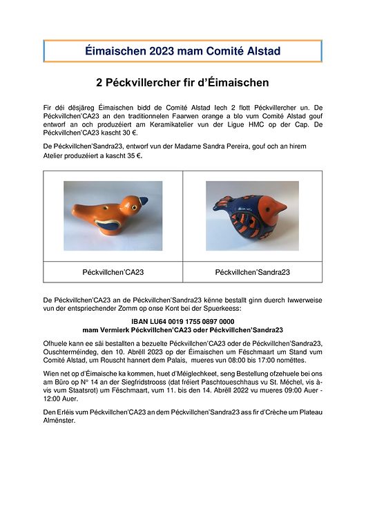Luxemburg - Zentrum Éimaischen 2023 mam Comité Alstad Guy Jourdain Veröffentlicht am Samstag, 11. März 2023 um 11:42 2 Péckvillercher fir d’Éimaischen um Fëschmaart Unpassenden Inhalt angeben Weitere Neuigkeiten von Guy Jourdain > ZEIHUNDERTSTERGEBURTSTAG VOM 1. STAATSARCHITEKTEN : CHARLES ARENDT 02.12.25 Luxemburg - Pfaffenthal E schéine Souvenir vum Comité Alstad als Erënnerung un den Trounwiessel 2025 15.07.25 Luxemburg-Stadt Eng flott Kaddo's-Iddi fir Chrëschtdaag vum Comité Alstad asbl 28.11.24 Luxemburg-Stadt D'ROUSEKRANZ-PRËSSESSIOUN ... eng alstater Traditioun déi verschwonnen ass ... 06.10.24 Luxemburg - Zentrum 100. GEBUERTSDAG VUM JULIEN HOFFMANN (31.05.1924 - 06.06.2007) 24.05.24 Luxemburg - Zentrum