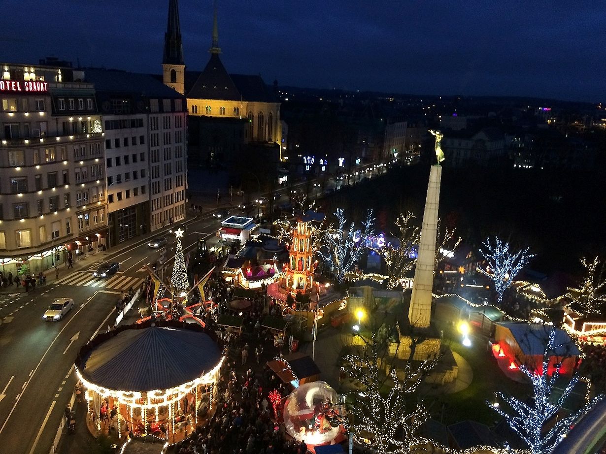 D'Chrëschtzäit ass voll amgaangen an iwwerall liicht et a blénkt et an alle Faarwen. E schéint Bild iwwert des flott Chrëschtdagsstëmmung bitt sech de Léit déi en Tour mam Riserad maachen. Wann e vun uewen erof iwwert dëse Chrëschtmaart kuckt an déi vill Liichtercher blénke gesäit dann ass e mat senge Gedanke scho ganz no bei Chrëschtdag.