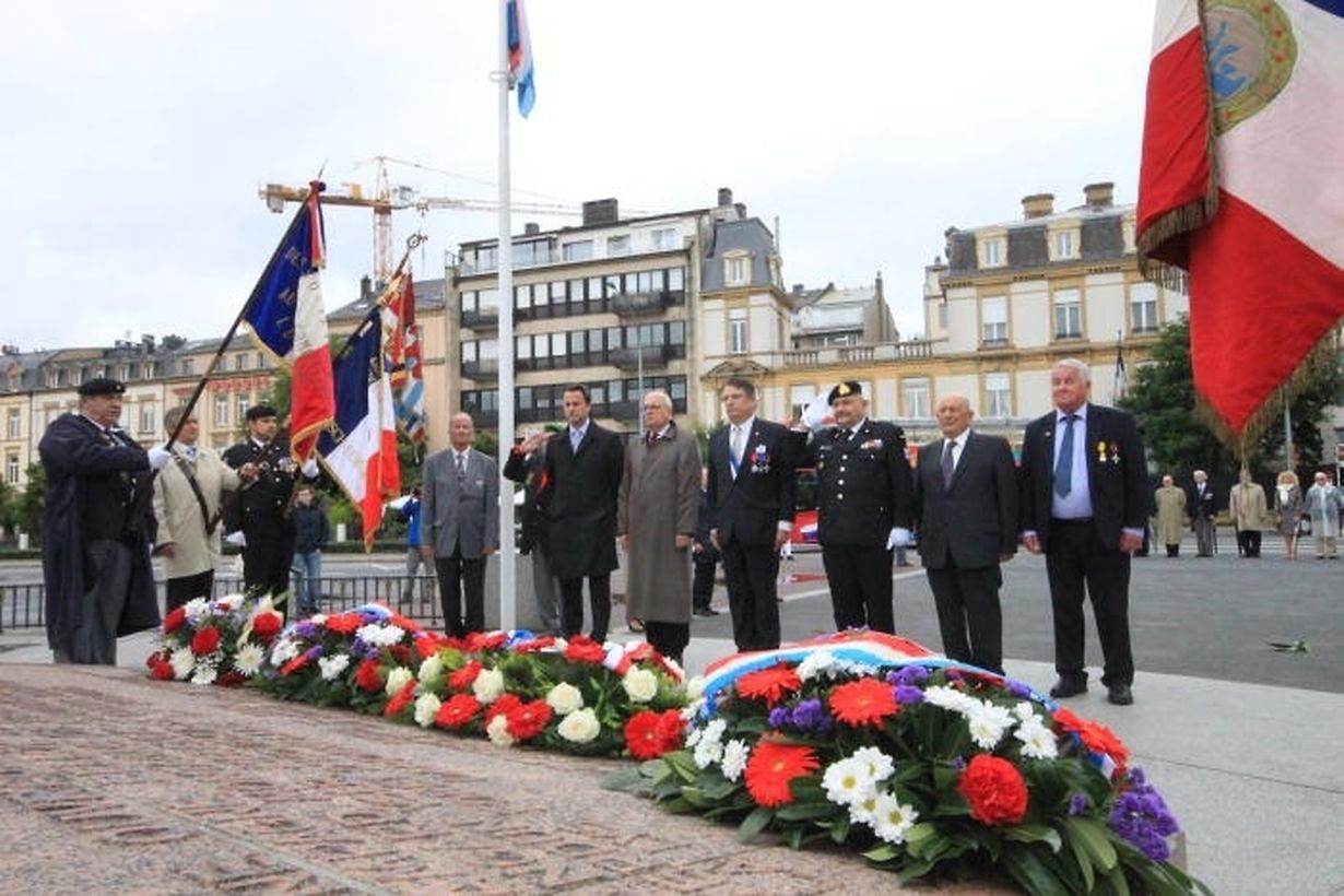 Erst 90 Jahre später, am 6. Juli 1880 wurde der Jahrestag des Föderationsfestes zum Nationalfeiertag erklärt. Kürzlich hatte die „Fédération des associations patriotiques françaises au Grand-Duché de Luxembourg“ alle zivilen und militärischen französischen und luxemburgischen Vereine, die der Devise „Liberté – Egalité – Fraternité“ nahe- stehen, zu einer Zeremonie auf die „Place de la Constitution“ eingeladen. Während des Zeremoniells standen die Fahnenträger der verschiedenen Vereinigungen Spalier. An der Blumenniederlegung nahmen der französische Botschafter Jean-François Terral, Hauptstadtbürgermeister Xavier Bettel, Pierre Girault, „Conseiller élu à l’assemblée des français de l’étranger“, die Delegation des „Souvenir français“, Jo Kohn, Präsident der „Anciens combattants luxembourgeois“ sowie Alain Hervigot in Vertretung von General Marc-Antoine Cauchie, der „Association des anciens combattants d’Afrique du Nord et Anciens militaires de l’Armée française au Grand-Duché de Luxembourg“ teil. Edmond Faber, clairon national de la Résistance, umrahmte musikalisch die Zeremonie mit dem „Chant des partisans“ und den Refrains der französischen und luxemburgischen Nationalhymnen. (Text/Foto: Gilbert Linster)