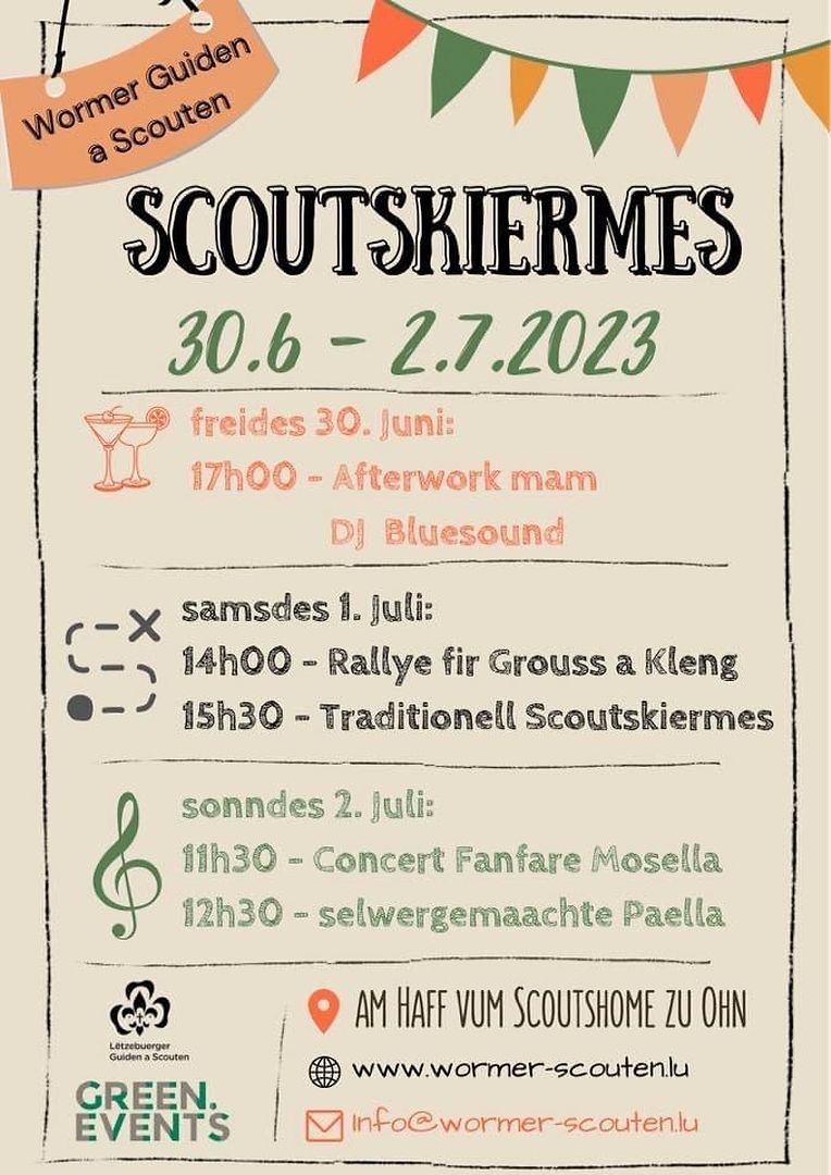 Die Wormer Guiden a Scouten aus Ahn laden Sie herzlich zu ihrer traditionellen Scoutskiermes ein, welche vom 30. Juni bis zum 2. Juli in Ahn beim Pfadfinderheim stattfinden wird.