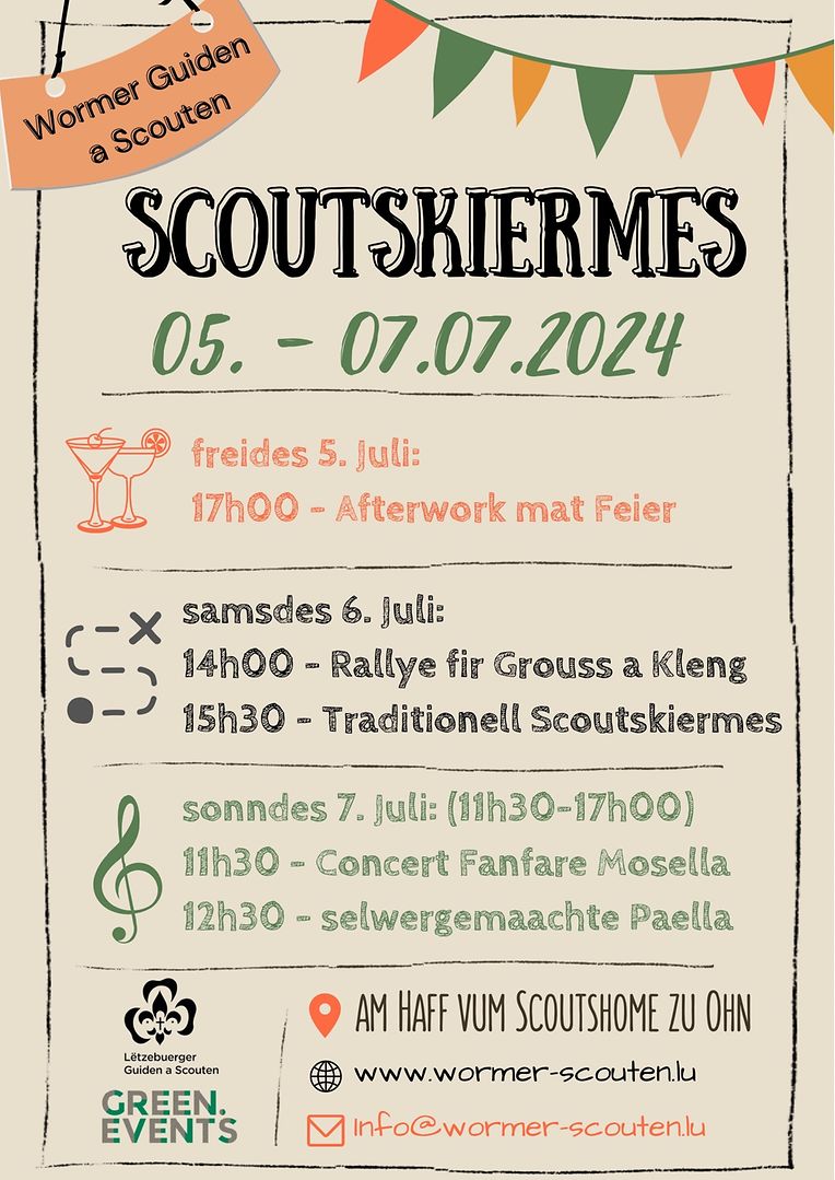 Die Wormer Guiden a Scouten aus Ahn laden Sie herzlich zu ihrer traditionellen Scoutskiermes ein, welche vom 5. bis zum 7. Juli in Ahn beim Scouts-Chalet stattfinden wird.