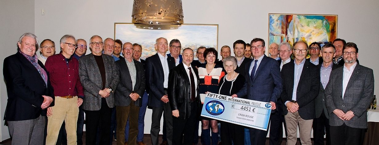 Als Präsident des Fifty-One Club Moselle überreichte Mill Reuter kürzlich dem Service de Transfusion Sanguine vom Roten Kreuz, vertreten durch Direktor Dr Paul Courrier, einen Scheck über 4451 €. Das Geld kam zusammen durch Spenden zur Ehrung und Erinnerung an den verstorbenen Robert Buschmann, der lange Zeit treibende Kraft im Verein war. Die Familie des Verstorbenen war vertreten durch seine Tochter Monique und seine Ehefrau Céline Buschmann. Dr Courrier ging kurz auf die Geschichte des Blutspenderdienstes ein, die 1928 mit 8 Spendern und Arm-zu-Arm Transfusionen begann. Heute kann das Rote Kreuz auf 13500 freiwillige Spender zurückgreifen, denen pro Jahr 24.000 Mal Blut entnommen wird. Jedes Jahr müssen 0.8 % der Bevölkerung Luxemburgs mit Blut oder dessen Derivatprodukten behandelt werden. Um den Bedarf des Landes auch künftig abdecken zu können, muss das Rote Kreuz jährlich 1000 neue Spender rekrutieren.