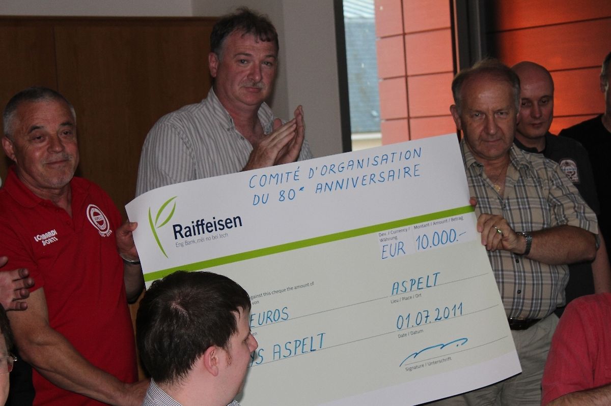A la suite, Nico Neyen, président du Comité d’Organisation du 80 anniversaire du FC Red Boys Aspelt, prit la parole. Il exposa comment le Comité, durant quatre années, à savoir de 2007 à 2011, a travaillé pour collecter de l’argent. La recette des différentes manifestations fut ensuite remise, sous forme de chèque symbolique, entre les mains du président du FC Red Boys. Il s’agit, somme toute, d’un montant de 10.000 euro!