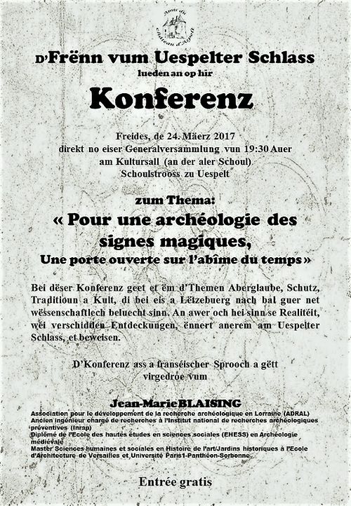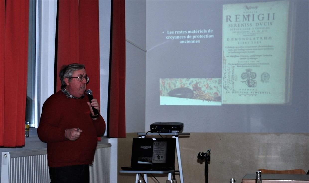 Nach der Generalversammlung gab der sich im beruflichen Ruhestand befindliche lothringische Archäologe Jean-Marie Blaising eine sehr interessante Konferenz über mystische Zeichen, Aberglaube, Schutz und Tradition unter dem Namen “pour une archéologie des signes magiques / une porte ouverte sur l’abîme du temps”