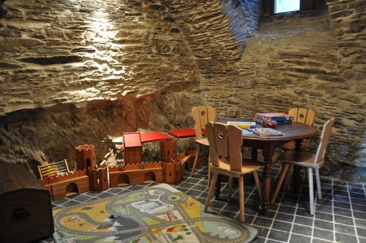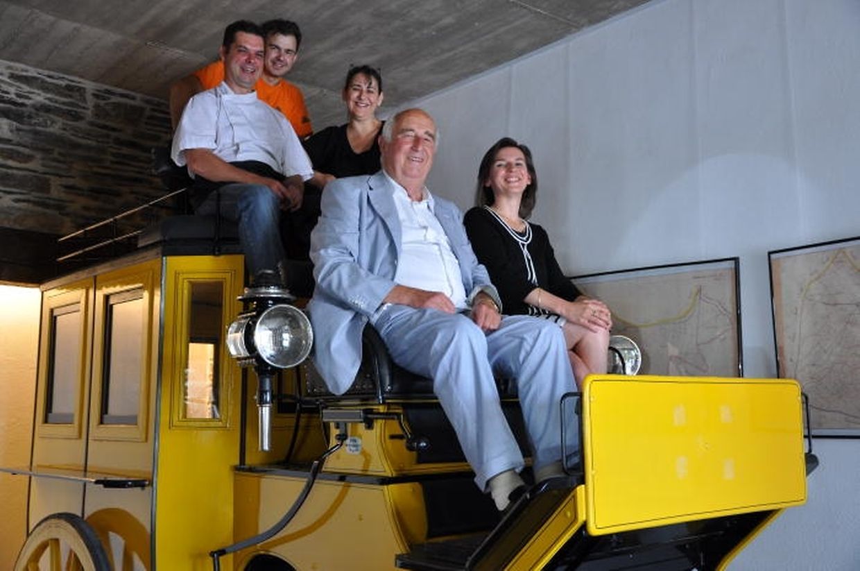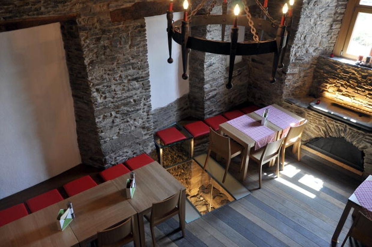 Gemütlich und einladend wirkt der rustikale Speisesaal mit Platz für 25 bis 30 Gäste. Der wiederentdeckte sieben Meter tiefe Brunnen ist durch eine Glasplatte einsehbar. Gleich nebenan gibt es eine abgetrennte Spielecke für die kleinen Gäste. Im ähnlichen Ambiente präsentiert sich die Brasserie mit einer Postkutsche als Blickfang. Dort können weitere 35 Personen bewirtet werden, und auf der sonnigen Terrasse stehen Plätze für zusätzliche 20 bis 30 Gäste bereit.