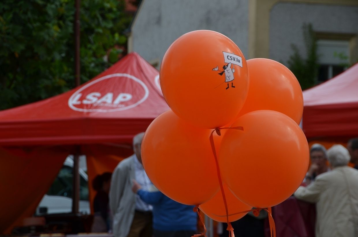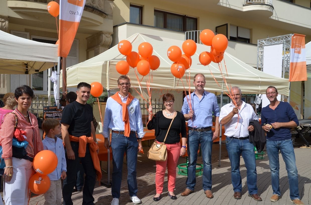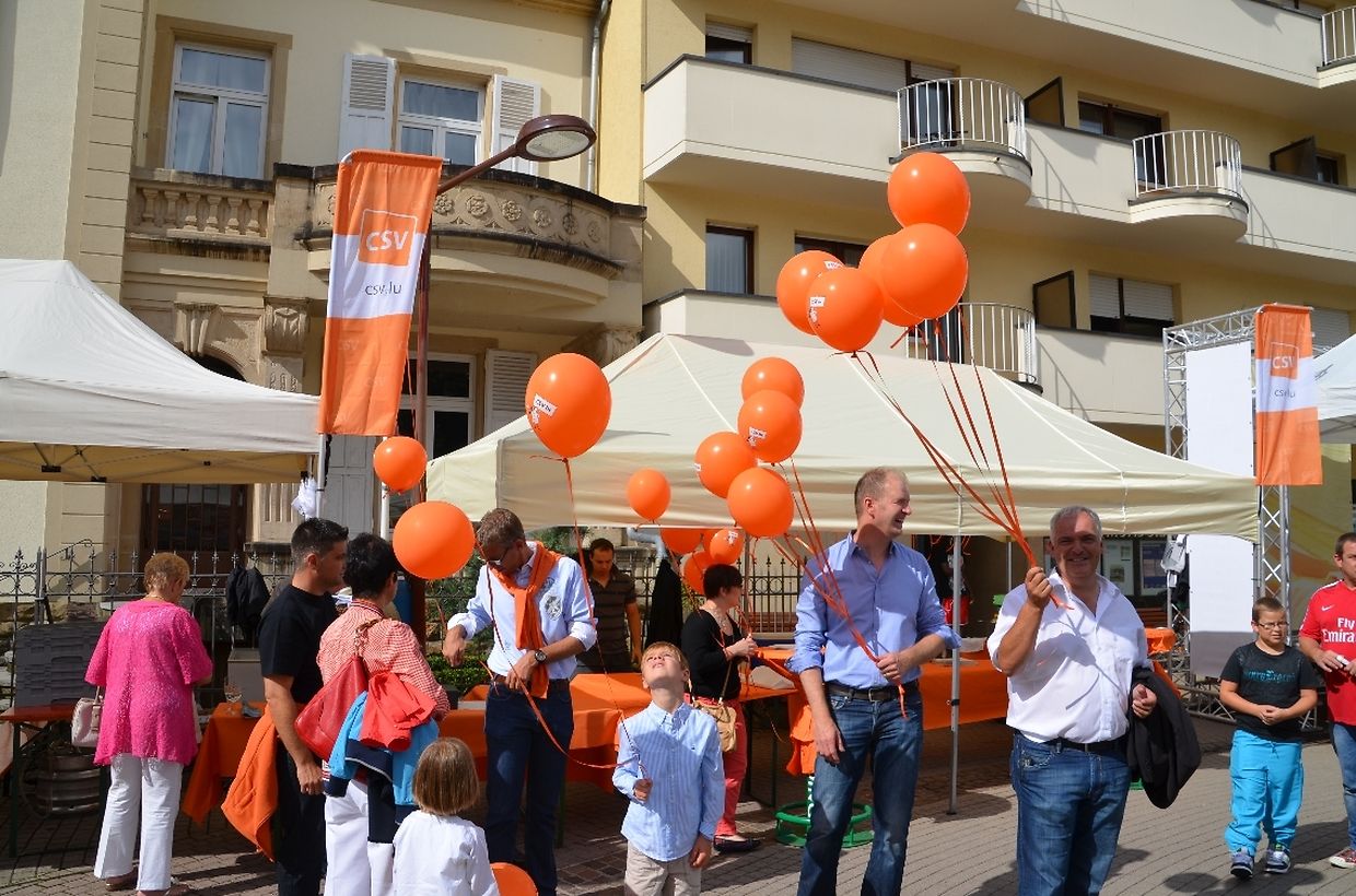 Um Stand vun der lokaler CSV Sektioun konnt een an enger flotter Atmosphäre nët nëmmen e Patt drenken an e Maufel iessen mee och esouz munnech Gadget'en an d'Täsch stiechen a sech zu aktuellen Themen aus der lokaler an der nationaler Politik emfroën. Fir d'Kanner goufen et Loftballon'en an Gesiichtsmoolerei. Déi orange Faarf huet op dësem Dag nët nemmen e bëssen Summer an d'Spill bruecht, mee och léiwt Laachen op d'Gesiichter vu munnech Kanner an Erwuessener wéi d'Fotoen et beweisen :-)