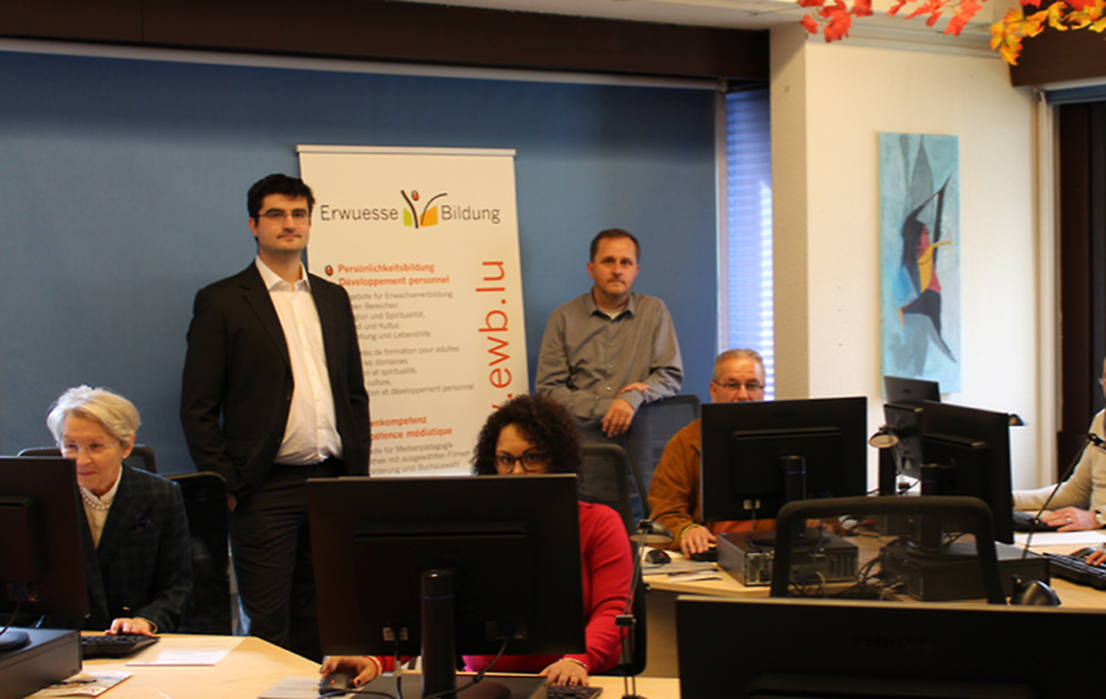 Zwischen April und Juli 2018 haben die „Schüler“ Grundkenntnisse zur Computernutzung erworben. Unter der kundigen Anleitung der beiden Kursleiter, Alex Greenwood und Marc Nilles, erarbeiteten sie von der Bedienung der Maus und Tastatur bis hin zu Textverarbeitung, Internetrecherche und E-Mail die nötigen Kenntnisse für den sicheren Umgang mit dem neuen Medium.