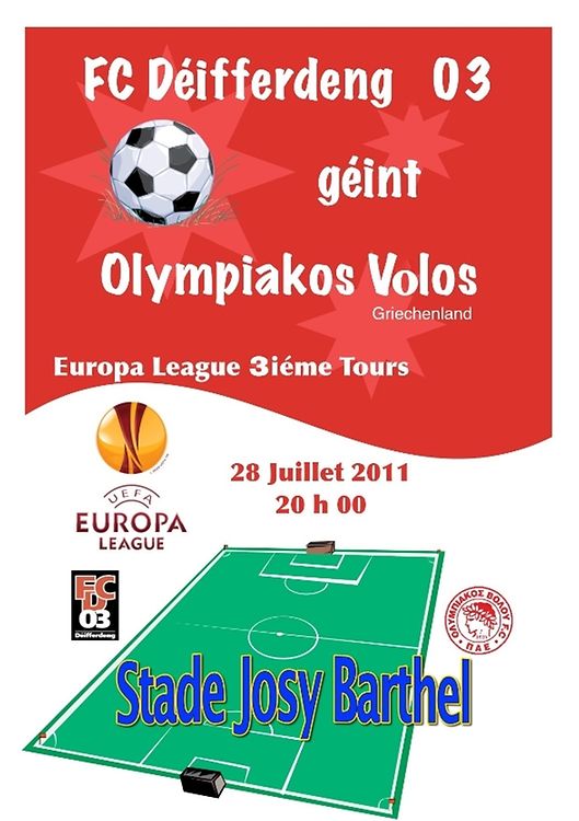 Luxembourg - Gare FC Déifferdeng géint Olympiakos Volos ( Griechenland ) Valy Wagner Published on Tuesday, 26 July, 2011 at 19:55 Jeudi le 28 Juillet à 20 h 00 Stade Josy Barthel ( Luxembourg ) Report inappropriate content More news by Valy Wagner > BADMINTON Izeg 1 vs Schëffleng 1 16/10/11 Hesperange Badminton Izeg vs Scheffleng 15/10/11 Itzig Paris St.Germain - FC Differdange 03 2 - 0 28/08/11 Differdange TENNIS PETANGE " ITF ROLLER OPEN 2011 " 18/07/11 Pétange FC Déifferdeng 03 29/06/11 Differdange