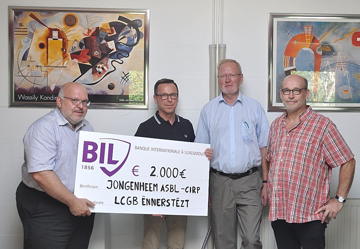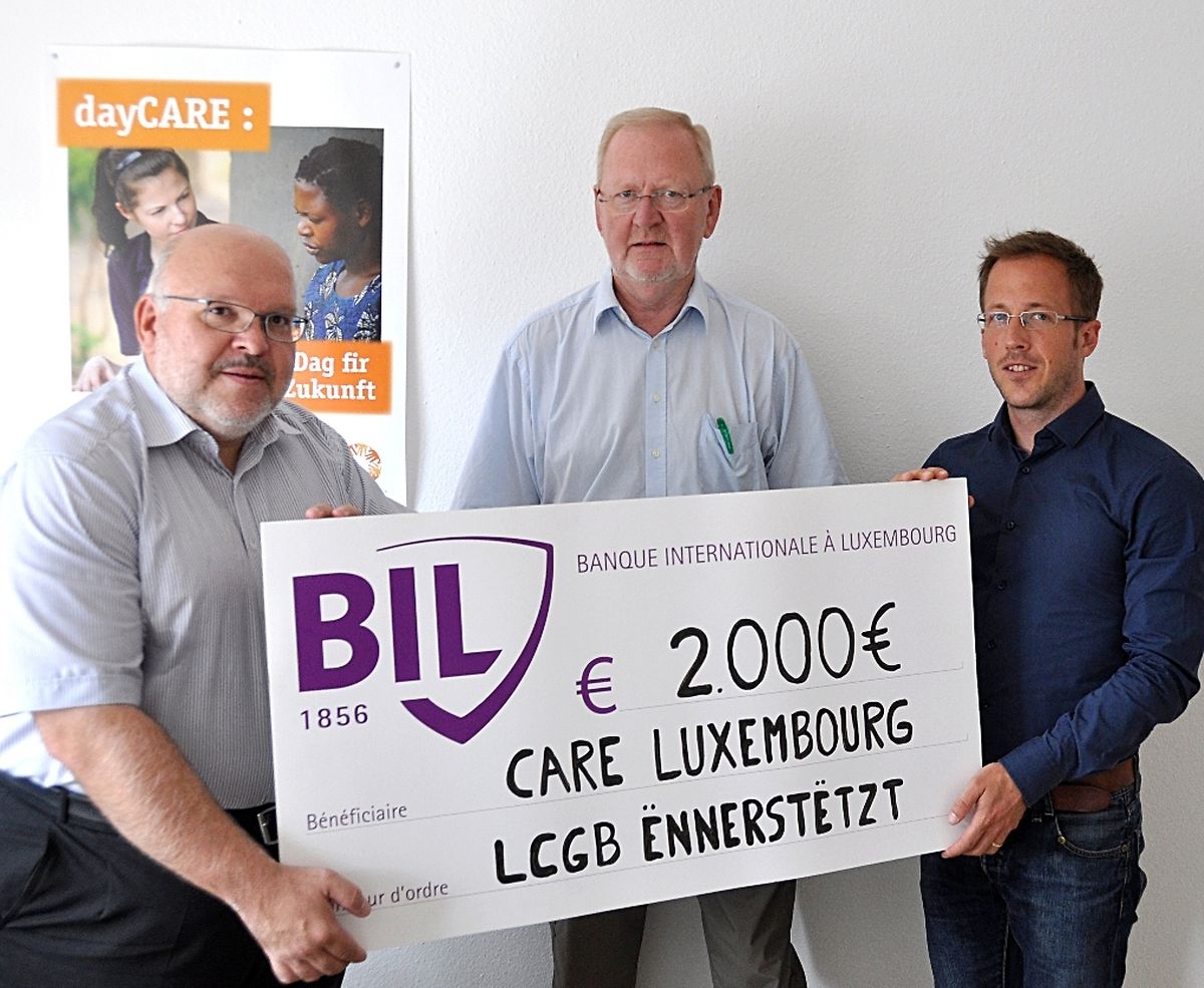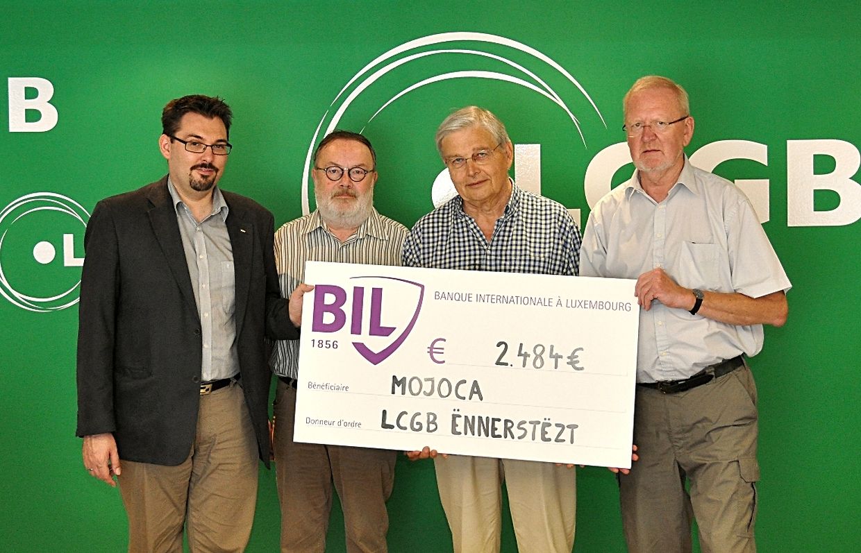 Der LCGB spendet 6.484 € zur Unterstützung von drei Hilfsorganisationen: CARE Lëtzebuerg, Jongenheem Asbl-CIRP und MOJOCA. Als Gewerkschaft, vertritt der LCGB die Rechte und Interessen von Arbeitnehmern, Rentnern und all jenen, die unsere Mitarbeiter um Auskünfte, Beratung und Beistand aufsuchen. In diesem Sinne, möchte der LCGB die Organisationen, die Menschen in Not in Luxemburg und im Ausland begleiten und helfen, unterstützen.