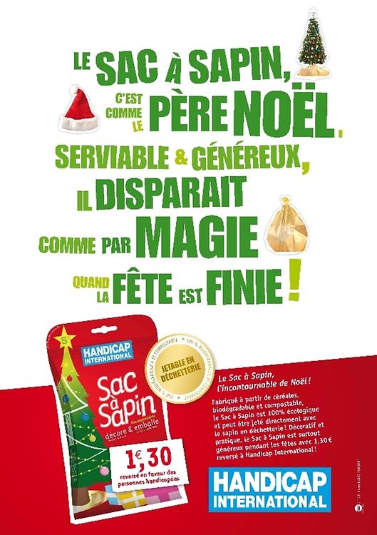 Pratique, il décore le pied du sapin pendant les fêtes, protège le sol des aiguilles et permet de l’emballer après ! Généreux, pour chaque Sac à Sapin vendu 5€, 1,30€ sont reversés au profit des actions humanitaires de Handicap International pour agir en faveur des personnes handicapées dans plus de 60 pays. Solidaire, il est entièrement fabriqué en France par un Etablissement de Service d’Aide par le travail, qui a pour objectif de favoriser l’intégration sociale et professionnelle des travailleurs handicapées. Et enfin, écologique, le Sac à Sapin est 100% biodégradable et compostable !