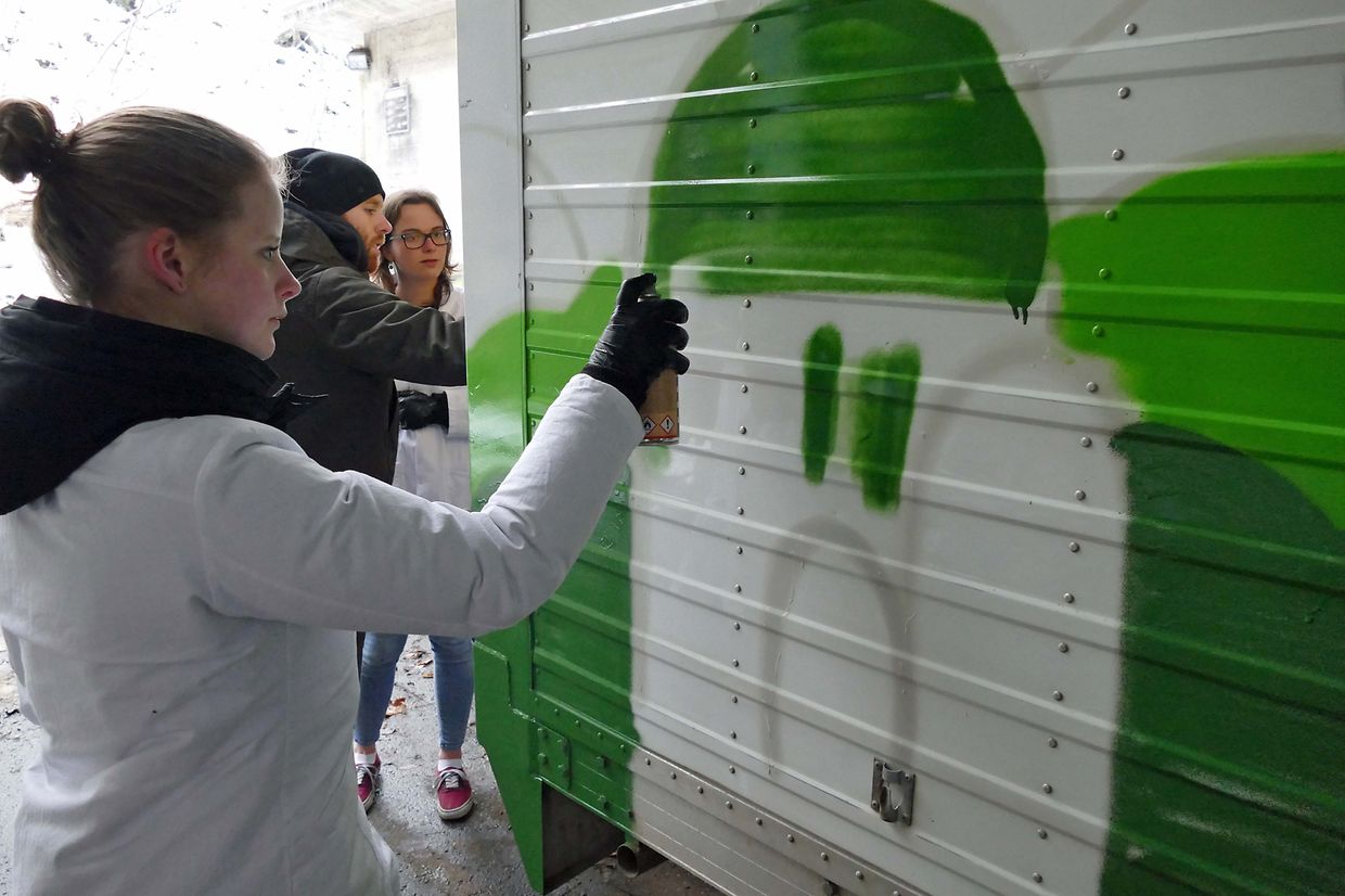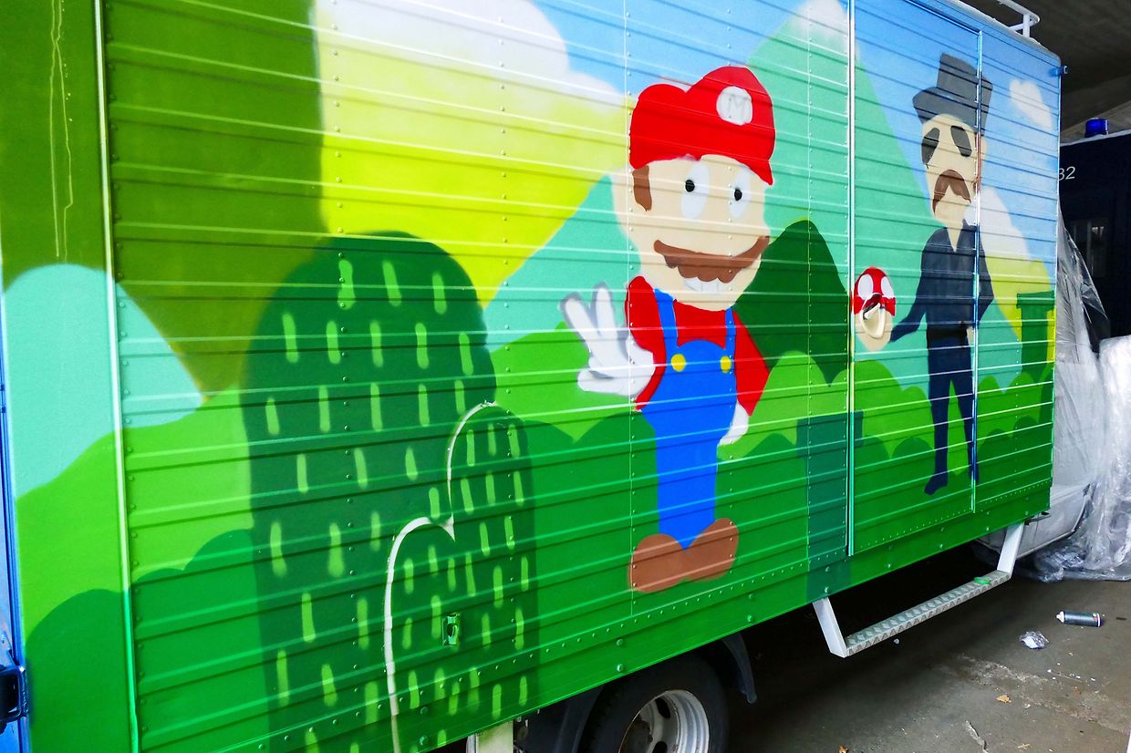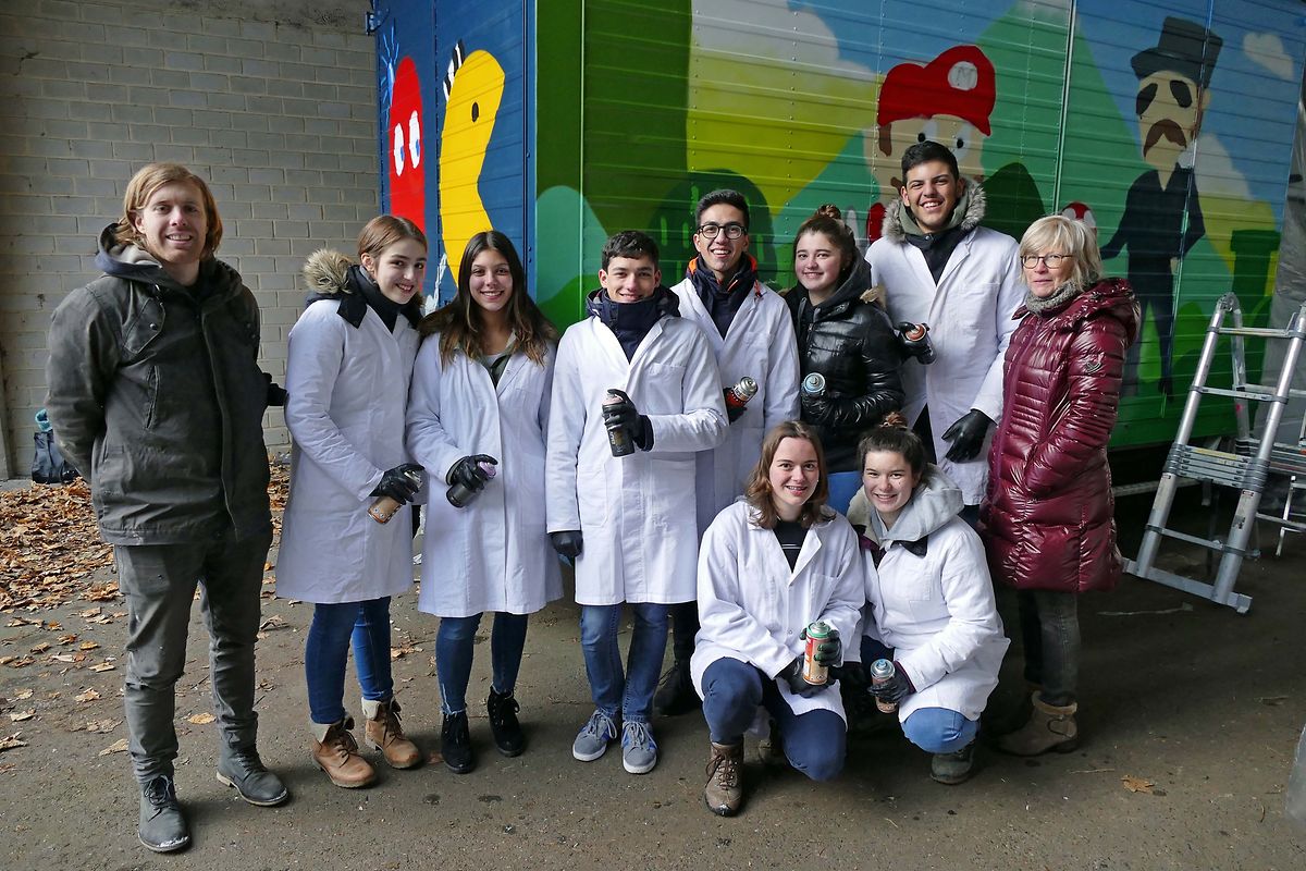 zeigten sich die Schüler Alexia, Audrey, Céline, Isabelle, Jeff, Lena, Maité, Marco, Matheus, Ramiz der Klasse C (Biologie, Chemie, Physik und Mathematik) des Lycée Michel Rodange bereit, in Luxemburg eine ähnliche Aktion zu starten. Es galt den Kasten eines Lieferwagens des Museums der Großherzoglichen Polizei künstlerisch zu gestalten. Auf kreativer Ebene wurde die Klasse von ihrer ehemaligen Kunstprofessorin Marie-Jo Reinhard-Trierweiler und dem Künstler Raphael Gindt begleitet. Anhand der von den Schülern vorgelegten Skizzen plante er die Zusammensetzung der Comic Figuren SpongeBop, Super Mario und Packmann und zeichnete das Grössenverhältnis der Figuren zum Wagenaufbau vor. „Urban Art ist eine junge Kunstrichtung des 21. Jahrhunderts, die ihren Impetus aus den Städten und ihrem Stadtleben bezieht. Die Kunst wird häufig von Künstlern, die in einem urbanen Umfeld leben oder eine Vorliebe für die Stadt aufweisen, ausgeübt. UrbanArt kombiniert Street-Art, Graffiti und weitere Spielarten moderner Kunstrichtungen.“ so der 25-jährige. Nach einer wasserdichten Behandlung wird der Comic-Van demnächst auf Luxemburgs Strassen sowie in Schulhöfen zu sehen sein und wird die Werbetrommel nicht nur für das Polizeimuseum sondern auch für die Verwaltung rühren.Weitere Informationen über die Entstehung dieses Projektes oder andere Aktivitäten des Polizeimuseums sind zu finden unter www.policemusee.lu (G.L.)