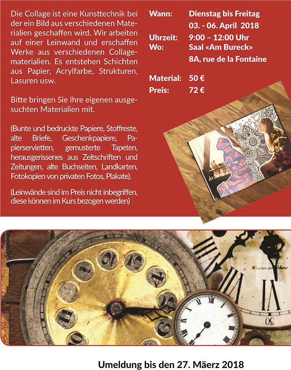 Die Collage ist eine Kunsttechnik bei der ein Bild aus verschiedenen Materialien geschaffen wird. Wir arbeiten auf einer Leinwand und kreieren Werke aus verschiedenen Collagematerialien. Es entstehen Schichten aus Papier, Acrylfarbe, Strukturen, Lasuren usw. Bitte bringen Sie Ihre eigenen ausgesuchten Materialien mit. (Bunte und bedruckte Papiere, Stoffreste, alte Briefe, Geschenkpapiere, Papierservietten, gemusterte Tapeten, herausgerissenes aus Zeitschriften und Zeitungen, alte Buchseiten, Landkarten, Fotokopien von privaten Fotos, Plakate).