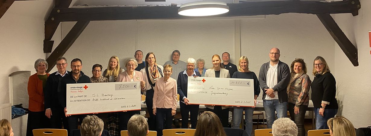 D’Presidentin Janine Reuland-Schneider huet d’Madame Buergermeeschter Monique Smit-Thijs, esou ewéi d’Vertrieder vun der Gemeng d'Madame Martine Buck, den Här Henri Oberhausen-Krippler vun der Croix-Rouge, d'Madame Jil Scolati vum Jugenroutkraiz, den Här François Authelet vum Service Aides matérielles et alimentaires an all d’Quêteusen begréisst. No enger Gedenkminutt fir déi verstuerwe Membere vun der Sektioun huet d’Presidentin e Reckbleck op e gutt gefëllten d’Joer 2024 gemaach an si ass op de Programm vun dësem Joer agaangen. De Programm vum Joer 2024 huet d'Suzette Decker am Detail virgedroen.D'Sektioun war do ënner anerem bei der Journée de bienvenue, dem Multi-Kulti, dem Nationalfeierdag an der Commémoration nationale esou ewéi dem Wantermaart vun der Gemeng derbäi. Och den traditionellen Floumaart bei den Hunnen huet stattfond, gradesou war d'Sektioun um Floumaart den November am Centre Atert derbäi.Duerno huet d'Simone Kremer-Schonckert de Keesebericht presentéiert. D'Kees ass ganz gesond, wat déi 2 Keesereviseusen bestätegt hunn.Beim Mois du Don 2024 sinn 9.130€ fir d'Sektioun gespent ginn. Dank dem Don beim Doud vun der Quêteuse Léa Geimer-Wampach, déi eis leider dat lescht Joer vill ze frei verlooss huet, konnt e Scheck vun 10255 € un d'Jugendroutkraiz gemach gin. En 2ten Scheck vun 7500 € ass iwwerreecht ginn un de Service Aides matérielles et alimentaires.Nodeem dass d'Madame Jil Scolati an den Här François Authlet hire Service virgestallt hunn sinn nach déi Dammen: Decker Suzette,Terrens Liliane,Vitali Triny,Federspiel Béa,Schaack Danielle an Hansen Nicole fir 10 Joer geéiert ginn an d'Madame Giersch Eugénie fir 30 Joer. Die Dammen Thein-Jemming Margot a Pepin-Klosen Mireille sinn nei am Comité opgeholl ginn. No ville léiwe Wieder vun der Madame Monique-Smit-Thijs ass déi desjährech Generalversammlung bei engem Patt an engem klenge Maufel op en Enn gaangen.