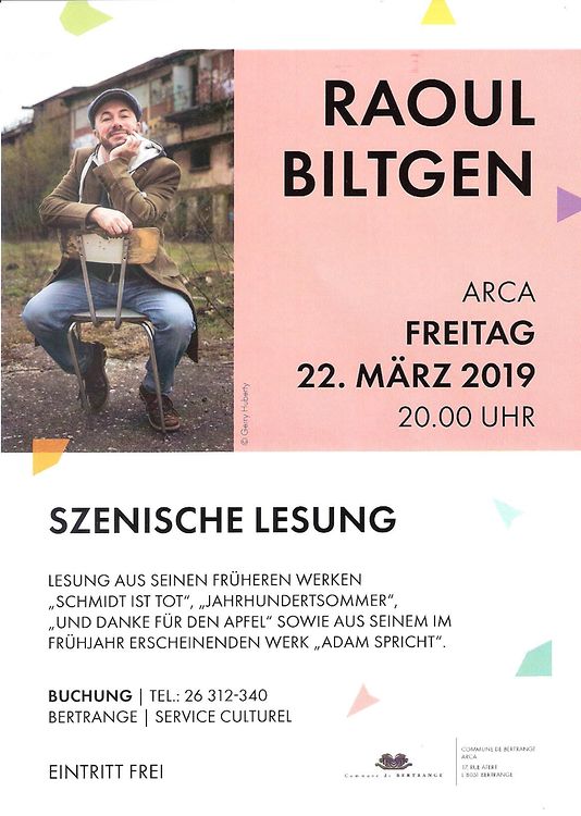 Der Schriftsteller, Schauspieler und Psychotherapeut Raoul Biltgen wird um 20:00 Uhr in der ArcA aus seinen früheren Werken, aber auch aus seinem im Frühjahr erscheinenden Werk "Adam spricht" lesen. Der Eintritt ist frei.