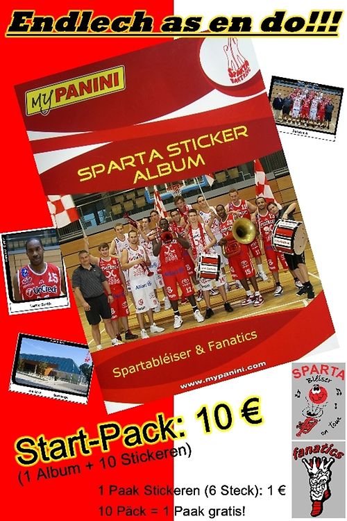 D'Sparta Bléiser an d'Fanatics stellen den nächste Samschdeg op der Kreschtfeier vun der Sparta hiren neie Panini Sticker-Album iwwert de BBC Sparta vir. Ausser Biller vun de Spiller vun der Seniors A Ekipp sinn all d'Ekippen vun der Sparta, d'Sporthalen vun der DBBL, eng Serie Larrie Smith, eng Serie Sparta Bléiser etc. ze kréien. De Verkaaf léeft vum nächste Samschdeg un.