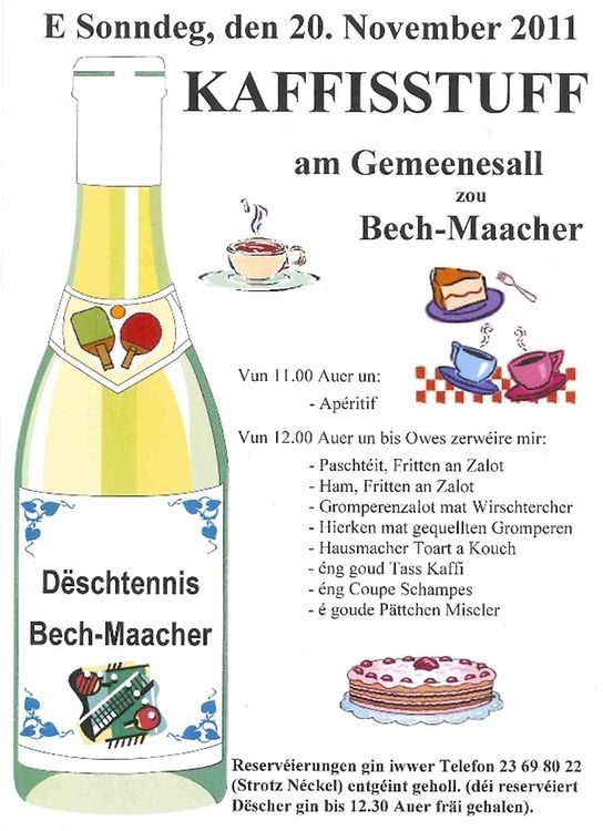 E Sonndeg, den 20. November 2011, invitéiert den Dëschtennis Bech-Maacher op séng traditionnell KAFFISSTUFF am Gemeenesall zou Bech-Maacher.