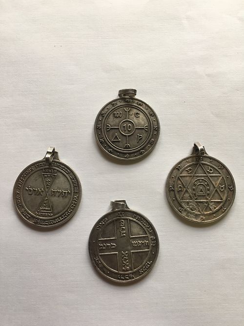 Bei den Motiven auf den Amuletten handelt es sich um eine Vermischung der traditionellen Zeichen der Kabbala und modernen esoterischen Zeichen. Die Beschriftung ist in hebräisch.
