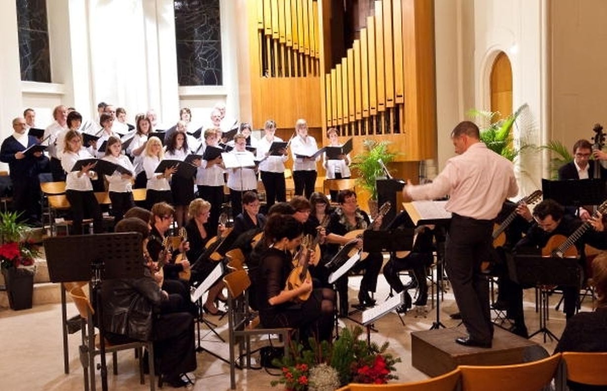 Am Flügel begleitet von Alain Bajot, boten die Musikanten anschließend einen musikalischen Vorgeschmack auf die Winterfeiertage mit der Weihnachtsfantasie „Tidings“, „An American Christmas“ und dem verträumten „White Christmas“. (AgKra) (Foto: Eric Brausch)