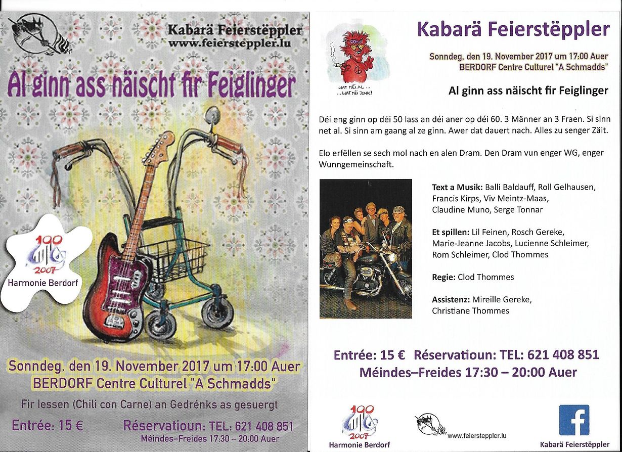 Berdorf Kabarä Feierstëppler 19 Nov 2017 19 Nov See More 19 Nov René Manternach Published on Monday, 16 October, 2017 at 16:17 29 Rue d'Echternach, 6550 Berdorf, Luxemburg Kabarä Feierstëppler "Al ginn ass näischt fir Feiglinger" Sonndeg den 19.November 2017 um 17.00 Auer zu Berdorf am Centre Culturel " A Schmadds " Reservatioun:Tel.621 408 851 Méindes bis Freides 17,30-20,00 Auer Entrée . 15 € Report inappropriate content More news by René Manternach > Kiermes zu Berdorf 15/07/20 Berdorf Wanterconcert Harmonie Berdorf 04/01/20 Berdorf Schülerauditioun Harmonie Berdorf 15/06/19 Berdorf Wanterconcert Harmonie Berdorf 25/01/19 Berdorf Galaconcert Harmonie Berdorf 28.04.2018 29/05/18 Berdorf