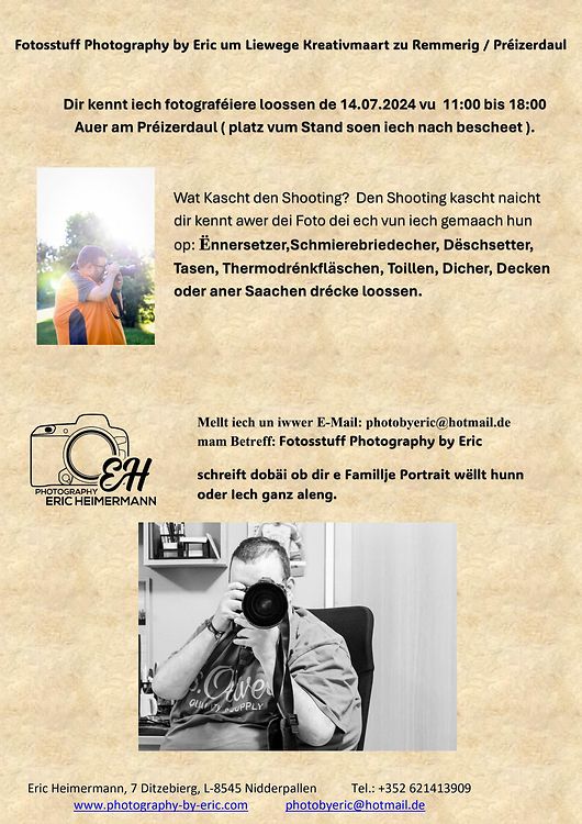 Dir kennt iech fotograféiere loossen de 14.07.2024 vu 11:00 bis 18:00 Auer am Préizerdaul ( platz vum Stand soen iech nach bescheet ).