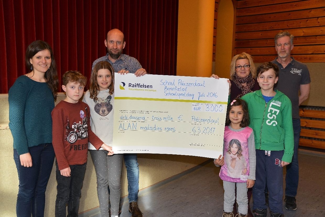 Préizerdaul: Im Rahmen des Schulsporttages hatten die Schüler von der Früherziehung bis zum Zyklus 4.2 aus der Grundschule im Préizerdaul gemeinsam mit ihrem Lehrpersonal ein „ Sponsored Run“ organisiert, um auf diese Weise Geld zu sammeln, um ein gutes Werk zu unterstützen. Ihre Wahl fiel auf die Vereinigung „Alan- Luxembourg- seltene Krankheiten“ und so machten die rund 140 Kinder sich auf die Suche nach Sponsoren und fanden dabei Patinnen und Paten, um diese Veranstaltung zu finanzieren. Sie liefen während des Schulsporttages im Juli 2016 mit voller Kraft ihre Runden und absolvierten dabei eine ganze Menge an Kilometern. Bei diesem Event mit sportlichem Charakter haben sich sämtliche Teilnehmer selbst übertroffen. Mit besonderem Stolz konnte dann vor kurzem der Erlös des Tages im Rahmen einer kleinen Feierstunde ein Scheck über 3 000 Euro an Marc Ries, Direktionsbeauftragter und Michèle Rihm, Psychologin, der Vereinigung „ Alan“ überreicht werden. Eingangs bedankte sich Jemp Sinner bei allen Schülern, Eltern, Helfer und Sponsoren, die am Schulsporttag teilnahmen, bevor beide Scheckempfänger im Anschluss an ihre Dankesworte die Zielsetzungen ihrer Vereinigung erklärten. „ Alan“ hilft Menschen, die mit einer seltenen Krankheit leben müssen, bringt sie zusammen, informiert und berät. In Luxemburg leben rund 30 000 Menschen mit einer seltenen Krankheit. Die Unterstützung aus dem Préizerdaul wird dazu dienen, die Aktivitäten und Projekte von „ Alan“ weiterhin zu finanzieren. (CR)(FOTOS: CHARLES REISER)