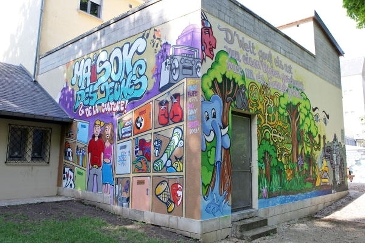 Das Bettemburger Jugend- und Kulturhaus verfügt mit seinem dahintergelegenen und zum Bering des Schlossparks gehörenden Gelände über eine einmalige Lage. Die kahlen Giebelwände des Anbaus brachten die Jugendlichen dazu, ihr Haus auch außen farbiger zu gestalten.