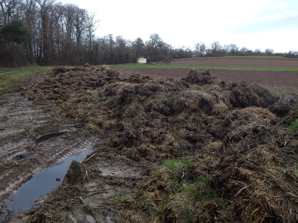 Eine solche Konzentration an Mist, welche nebenbei bemerkt immer wieder so abgelegt wird, dass die Gülle fast auf direktem Weg in die Syr fliessen muss... habe ich allerdings schon lange nicht mehr gesehen. Insgesamt 4 Mistberge mit einer Gesamtlänge von über 150 Meter im Umkreis von nicht einmal 700 Meter.