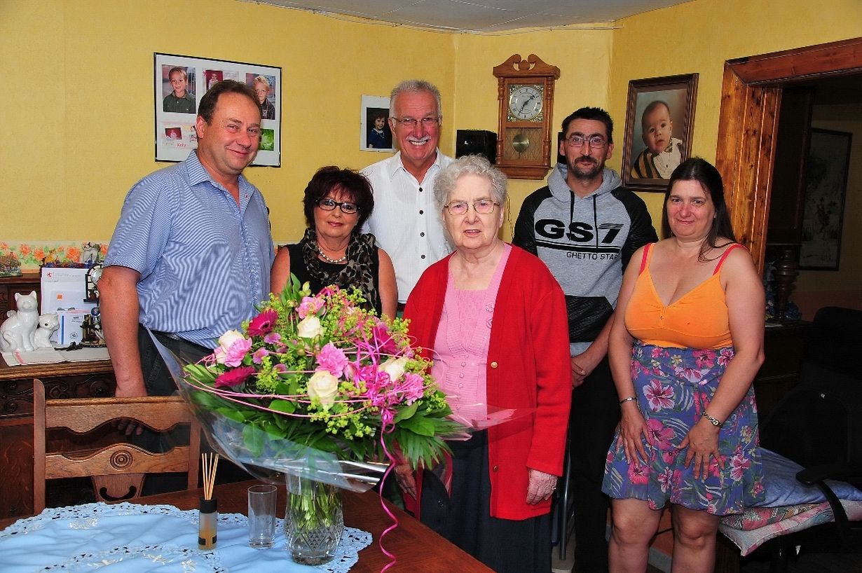 Boewingen/ Attert: Louise Verbeeck- Renkin aus Boewingen/ Attert wurde am 15. Juli 1930 in Lüttich geboren und konnte neulich bei guter Gesundheit auf stolze 85 Jahre zurückblicken. Am 11.August 1949 führte der ebenfalls aus Lüttich stammende Jean Verbeeck, seine Gattin Louise zum Traualtar. Das Paar zog im Jahre 1979 nach Boewingen/ Attert. Während Ehemann Jean seiner täglichen Arbeit im Nylonwerk „Fabric Plant“ auf Roost nachging, kümmerte Ehefrau Louise sich um den Haushalt sowie und ihre fünf Kinder. Die Familie erfreut sich heute über elf Enkel- und elf Urenkelkinder. Jean Verbeeck verstarb am 28. Dezember 1998. Bürgermeister Paul Mangen mit seinen beiden Räten Sylvie Gieres- Deitz und Jean- Claude Mathekowitsch, machten sich eine Ehre daraus, der 85-jährigen Jubilarin, Louise Verbeeck- Renkin zum Wiegenfest mit einem schönen Blumenstrauß die Glückwünsche aller Einwohner der Gemeinde Boewingen/ Attert entgegen zu bringen. (CR)(FOTO: CHARLES REISER)