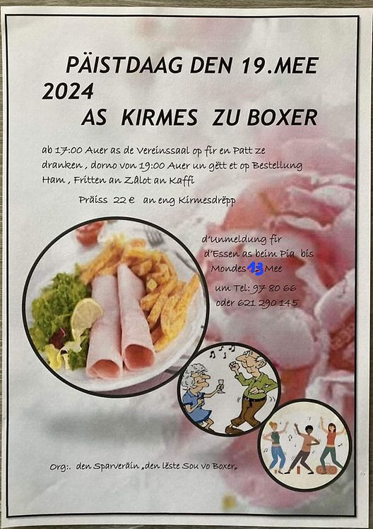 Boxhorn Kirmes zu Boxer 19 May 2024 19 May See More 19 May Jacques Sens Published on Saturday, 27 April, 2024 at 11:50 Boxhorn Wintger, Luxemburg Report inappropriate content