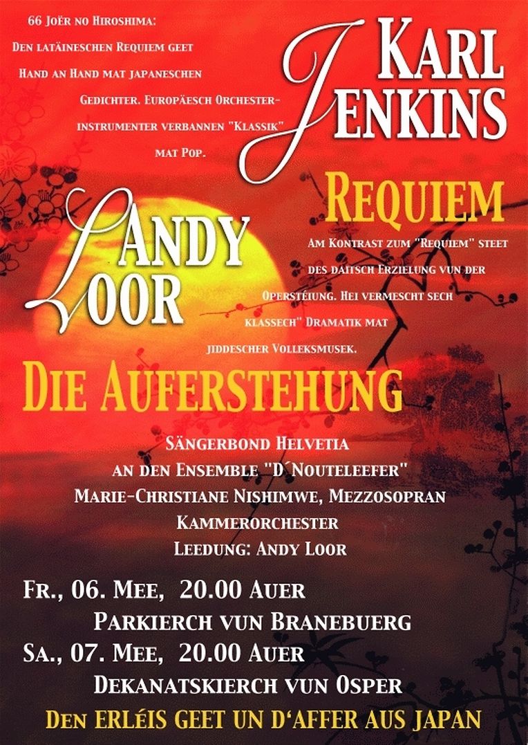 Inmitten der Proben ereilten uns die Katastrophenmeldungen aus Japan. Der Sängerbond Helvetia hat daraufhin beschlossen, das Requiem von Karl Jenkins im Gedenken an die Opfer aufzuführen. Der Erlös der beiden Konzerte fließt demnach über das Rote Kreuz notleidenden Menschen in Japan zu.