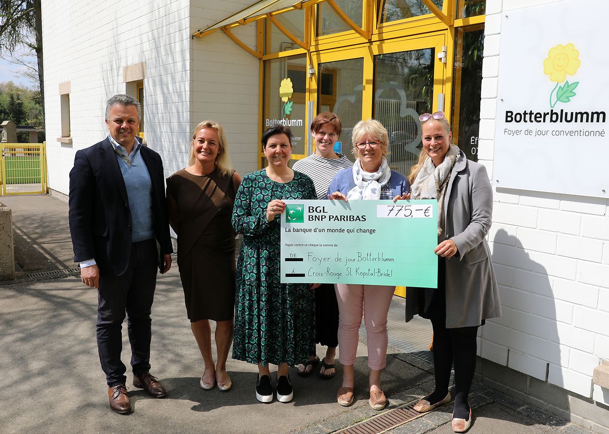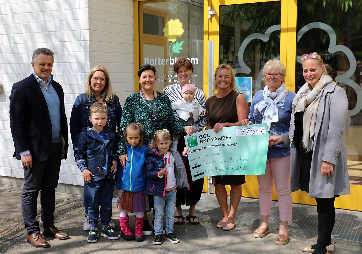 Bridel: Im Rahmen des nationalen Spendenmonates des Luxemburger Roten Kreuzes hat die Kindertagesstätte Botterblumm aus Bridel dieser Tage den ansehnlichen Betrag von 775 Euro an die Vertreter der Lokalsektion Kopstal-Bridel des Roten Kreuzes, Anastasia Weicker und Schöffe Raoul Weicker, überreicht. Direktionsbeauftragte Muriel Jeitz und die beigeordnete Leiterin Michèle Nilles unterstrichen die überaus bemerkenswerte Solidarität aller Mitarbeiter und der Eltern der betreuten Kleinen beim diesjährigen Ostermarkt, um diesen Beitrag zu erwirtschaften. „Den außerordentlichen Einsatz des Roten Kreuzes möchten wir nicht nur mit Worten würdigen, sondern auch mit einer kleinen finanziellen Unterstützung anerkennen“, betont Educatrice graduée Michèle Nilles. Die Präsidentin der Crèche-Trägervereinigung „Freed um Liewen“ Nicole Kuhn-Di Centa zeigte sich erfreut über die gelebte Solidarität des Foyer de Jour-Mitarbeiterteams. Die gespendeten Euro werden vom Roten Kreuz im laufenden Einsatz investiert, um Menschen in Not und den Flüchtlingen vor allem den traumatisierten Kindern aus der Ukraine die so wertvolle humanitäre Hilfe zukommen zu lassen.