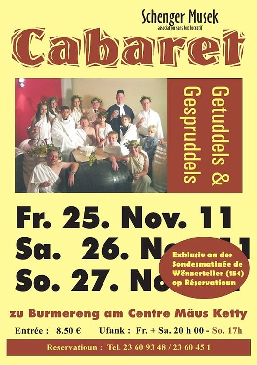 Auch in diesem Jahr lädt die „Schenger Musek a.s.b.l.“ wieder zu ihrem traditionellen humoristischen Jahresrückblick, dem Kabarett-Abend „Getuddels a Gespruddels“ ein. Am Freitag den 25. November, Samstag den 26. November, jeweils um 20 Uhr, sowie am Sonntag den 27. November 2011, bereits um 17 Uhr, heißt es im Centre „Maus Ketti“ in Bürmeringen dann Bühne frei für den satirischsten aller Rückblicke auf Politik und Gesellschaft aus dem Dreiländereck und der ganzen Welt. Wegen begrenzter Platzzahl ist es ratsam die Sitzplätze im Voraus auf der Nummer +352 23 60 93 48 oder +352 23 60 45 1 zu reservieren. Auf Vorausbestellung ist es dieses Jahr auch möglich sich Sonntags in der Pause mit einem Winzerteller kulinarisch verwöhnen zu lassen.