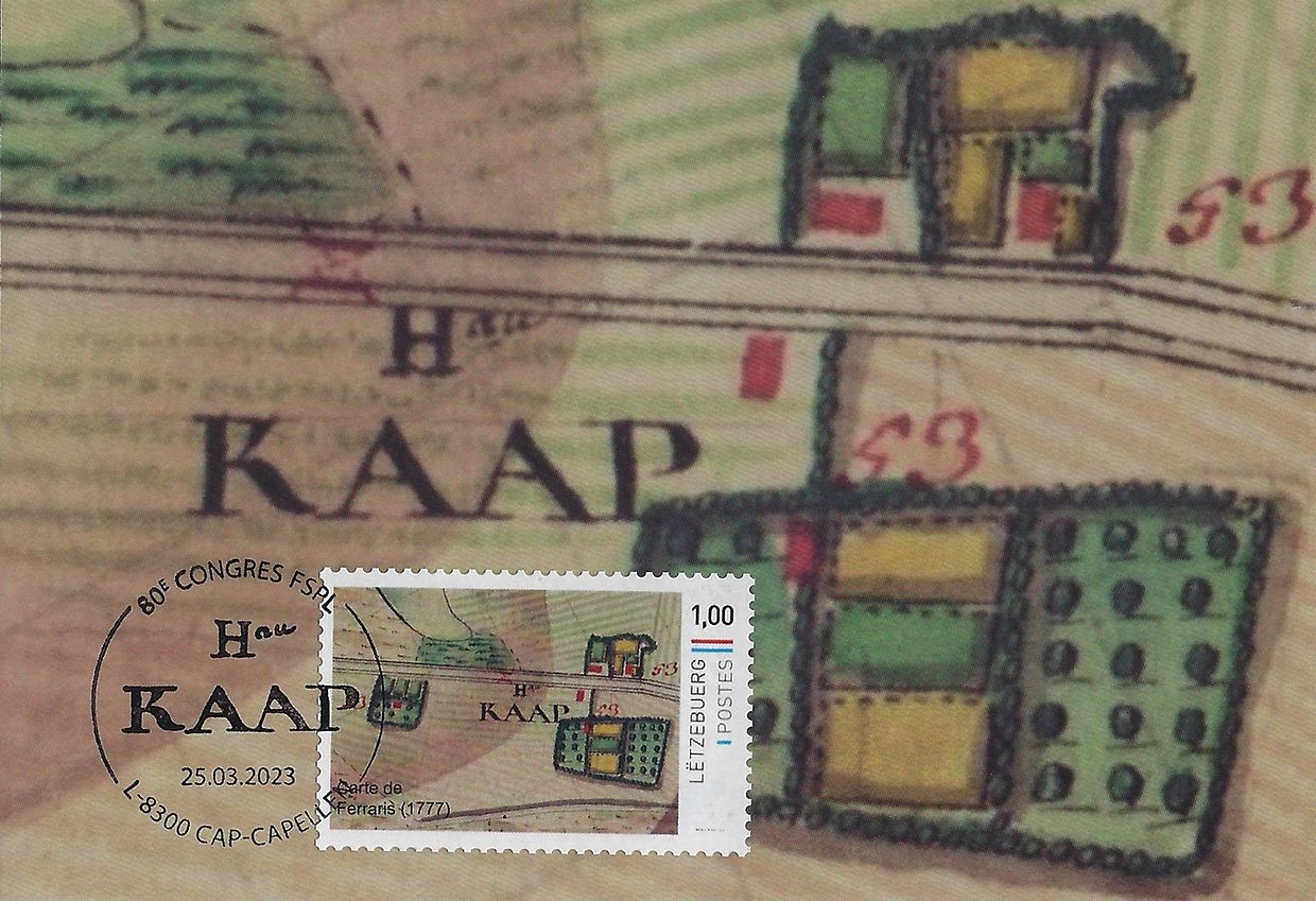 Passend zu dieser Veranstaltung hatte der Cercle Philatélique Mamer eine MengPost-Briefmarke und eine Postkarte mit dem « Hameau Kaap » (Weiler Kaap) herausgegeben, wie es 1777 auf der sogenannten Ferraris-Karte abgebildet ist. Dazu gab es noch einen Sonderstempel von POST Luxemburg, da der Kongress des Verbandes der Philatelistischen Gesellschaften Luxemburgs am Samstag im selbigen Kulturzentrum stattfand.