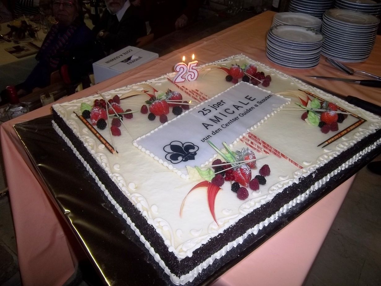 De lëschte Sonndeg huet d' Amicale vun den Centser Guiden a Scouten hire 25 te Geburtsdag gefeiert an zwar mat enger marche gourmande. Mir konnten 85 Invitée begréissen. Mir hun am Sall èennert der Kirch mam Kaffi ugefangen, duerno se mer an de Sall Gabriel de Marie gang, wou den Apéro servéiert gouf. Géint Mëtteg wore mer dun all zesummen am Junckerhaus ( Scoutshome )fir de Festmenu mam Geburtsdagskuch ze genéissen. Nodems de Präsident én klenge Reckblëck gemat hat, krut all Famill e Prabeli mam Emlême drop geschenkt, dén och gleich an den Asatz koum.