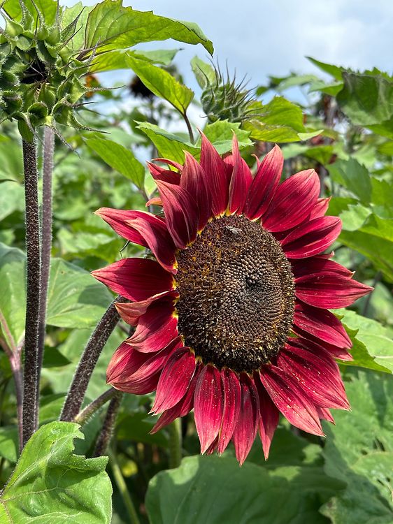 Le tournesol rouge Red Sun, Helianthus annuus, de la famille des Asteraceae, est une variété de mi-saison très ramifiée pouvant atteindre une hauteur de 2 m. Cette plante ornementale présente une dizaine de fleurs aux pétales rouge-jaune et au cœur noir, dont les graines se dégustent natures ou salées.