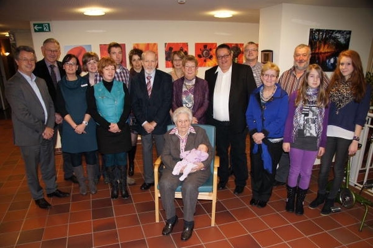 Zu ihrem Jubeltag besuchte Bürgermeister Emile Eicher sie mit seinen Schöffen Aline Schroeder, Romain Braquet und Georges Michels, um mit einem schönen Blumenarrangement die besten Glückwünsche zu überbringen. Im Namen des Hauses schlossen sich der Präsident des Verwaltungsrates Pierre Neser und aus der Direktion Dani Schanck und André Schroeder an. (TEXT/FOTO: JOSETTE RINNEN-KOCH)