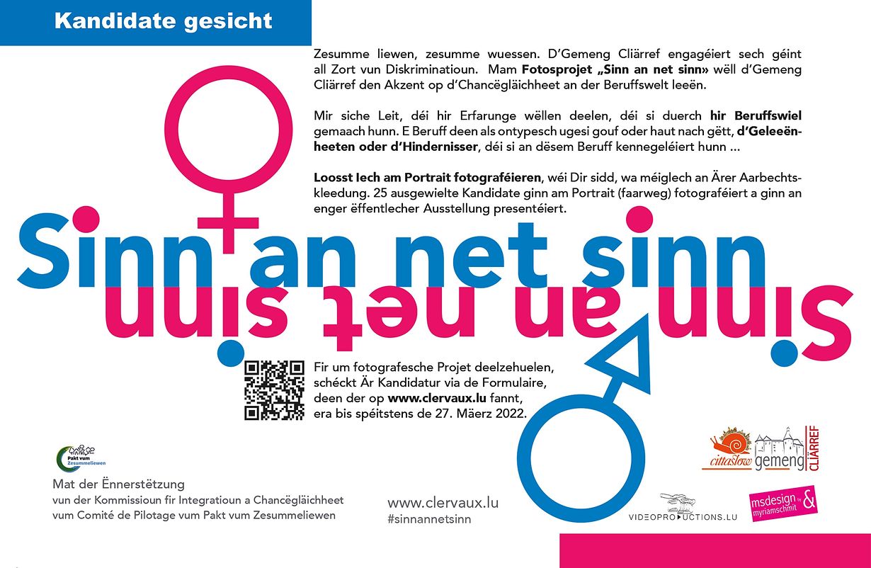 Die Gemeinde Clerf engagiert sich gegen jede Art von Diskriminierung und möchte mit dem Fotoprojekt „Sinn an net sinn“ („Sein und nicht sein“) auf das Thema der Chancengleichheit in der Berufswelt aufmerksam machen und informieren.